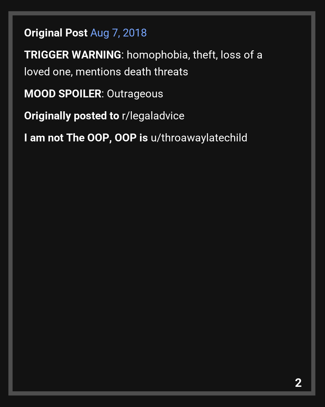 OOP Updated the next day when this was crossposted to r/bestoflegaladvice – Update 2 – Aug 8, 2018 (Next Day)