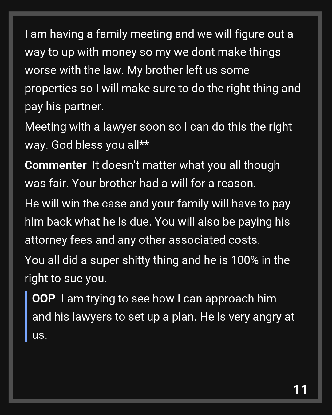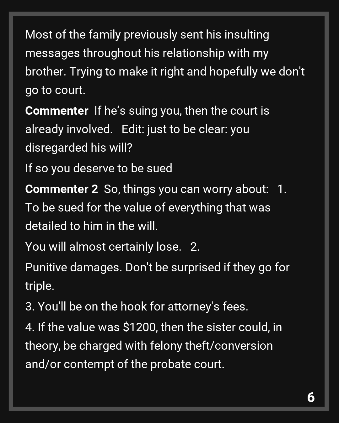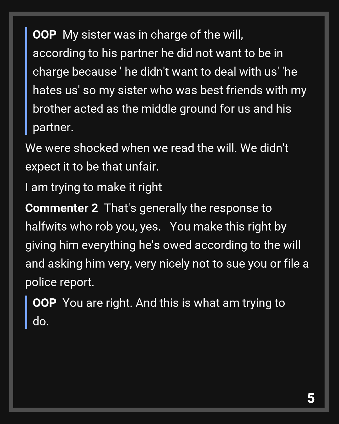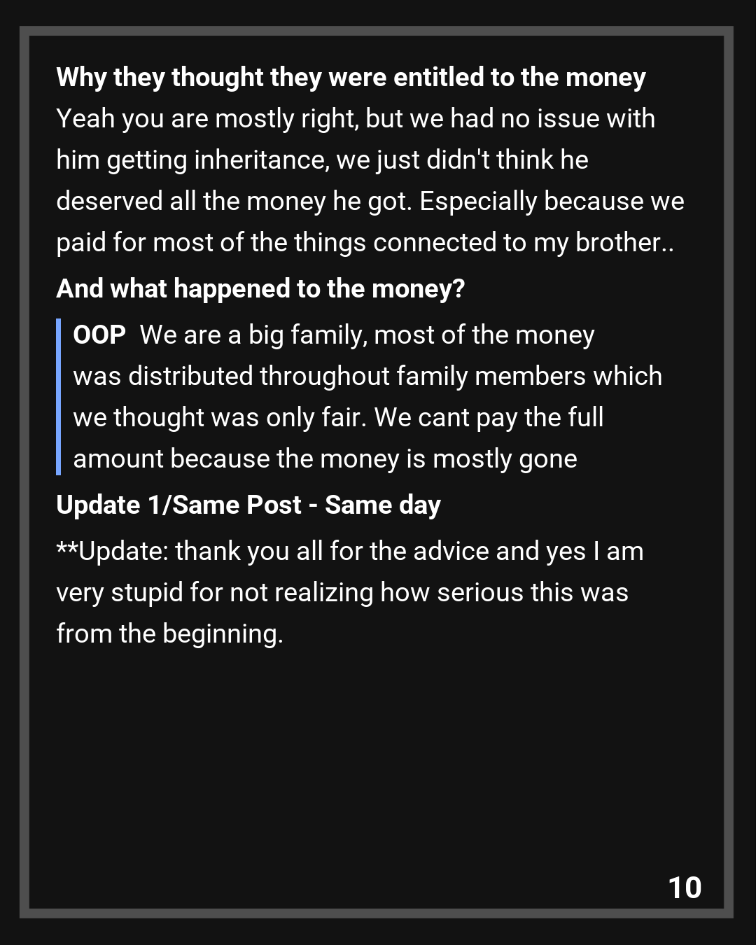 Yeah you are mostly right, but we had no issue with him getting inheritance, we just didn’t think he deserved all the money he got. Especially because we paid for most of the things connected to my brother..