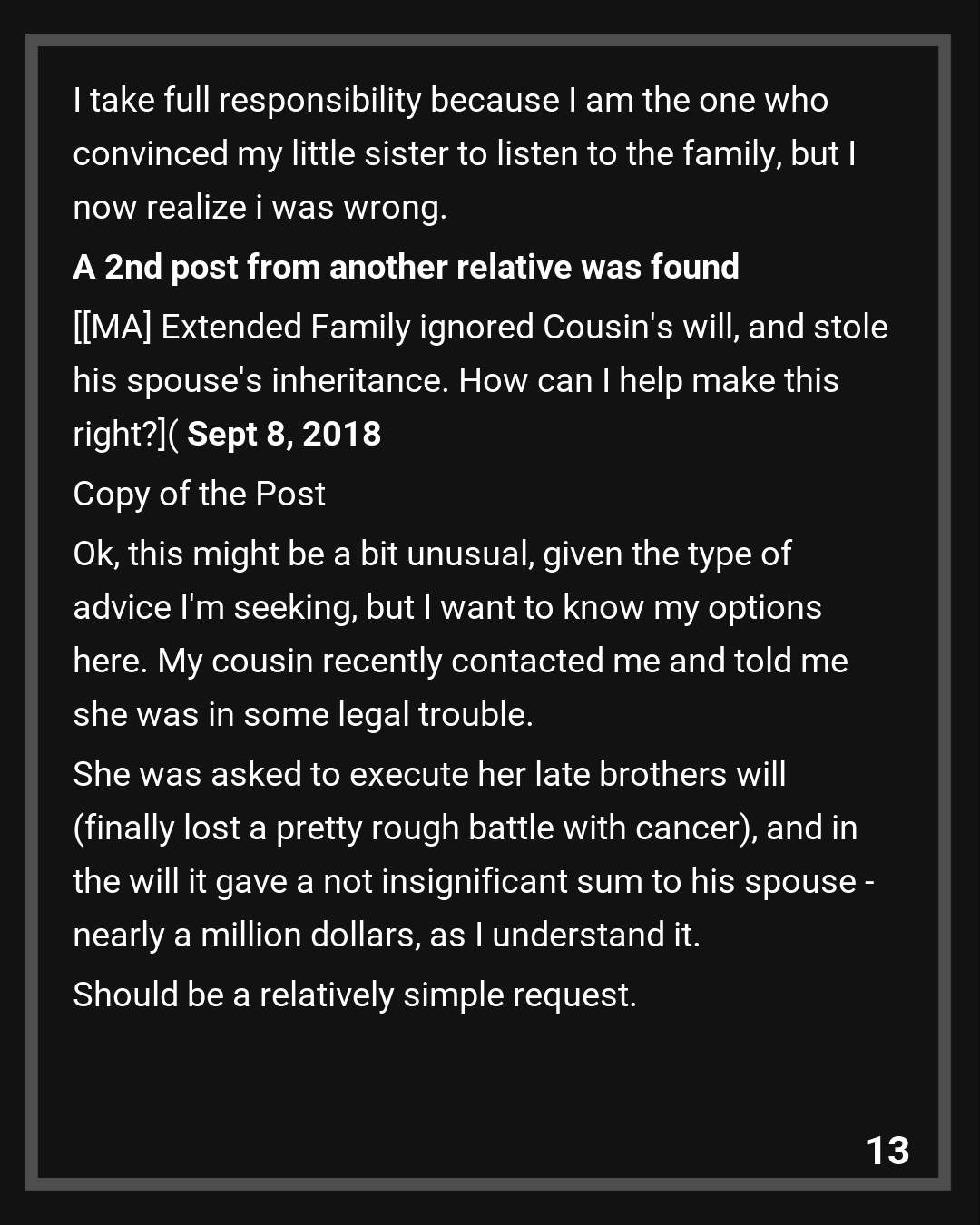 [MA] Extended Family ignored Cousin’s will, and stole his spouse’s inheritance. How can I help make this right? Sept 8, 2018