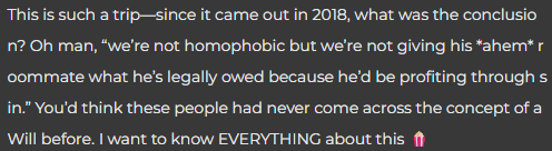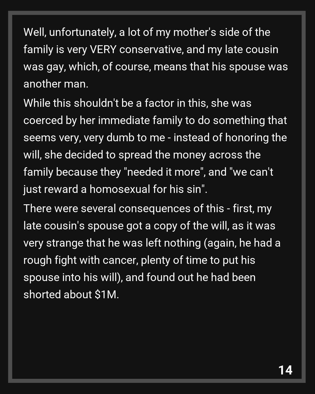 Well, unfortunately, a lot of my mother’s side of the family is very VERY conservative, and my late cousin was gay, which, of course, means that his spouse was another man. While this shouldn’t be a factor in this, she was coerced by her immediate family to do something that seems very, very dumb to me – instead of honoring the will, she decided to spread the money across the family because they “needed it more”, and “we can’t just reward a homosexual for his sin”.