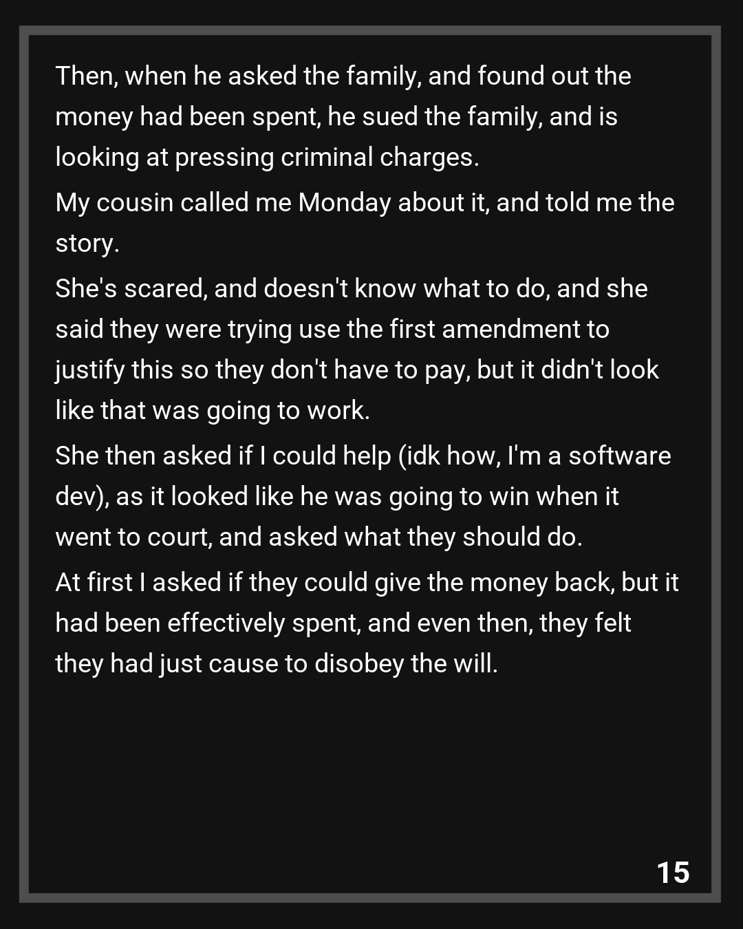 My cousin called me Monday about it, and told me the story. She’s scared, and doesn’t know what to do, and she said they were trying use the first amendment to justify this so they don’t have to pay, but it didn’t look like that was going to work. She then asked if I could help (idk how, I’m a software dev), as it looked like he was going to win when it went to court, and asked what they should do. At first I asked if they could give the money back, but it had been effectively spent, and even then, they felt they had just cause to disobey the will.