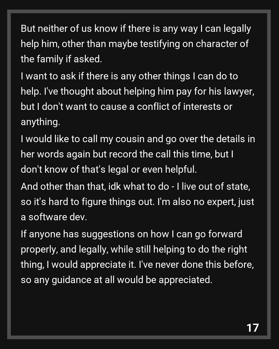 I want to ask if there is any other things I can do to help. I’ve thought about helping him pay for his lawyer, but I don’t want to cause a conflict of interests or anything. I would like to call my cousin and go over the details in her words again but record the call this time, but I don’t know of that’s legal or even helpful. And other than that, idk what to do – I live out of state, so it’s hard to figure things out. I’m also no expert, just a software dev.