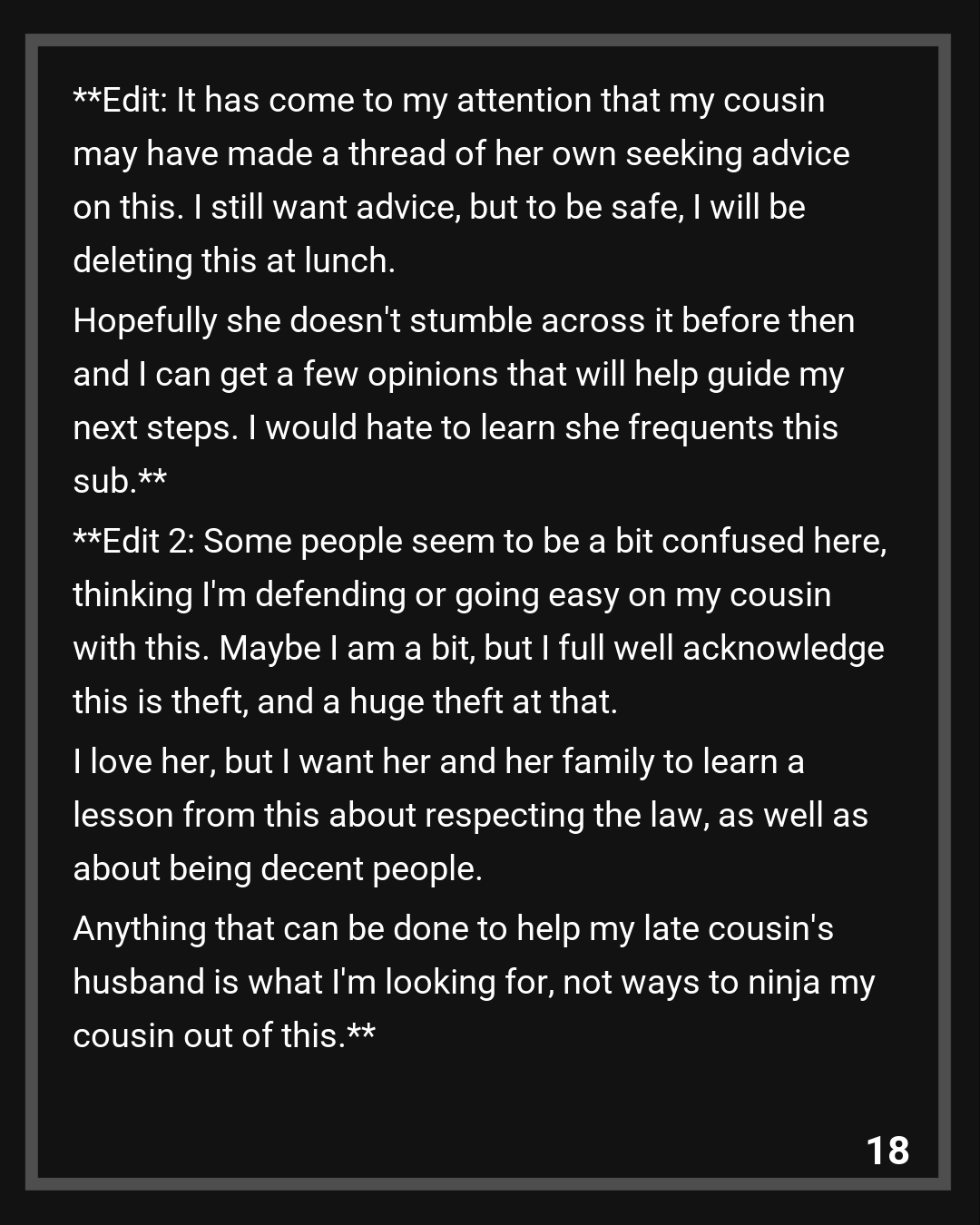 Edit 2: Some people seem to be a bit confused here, thinking I’m defending or going easy on my cousin with this. Maybe I am a bit, but I full well acknowledge this is theft, and a huge theft at that. I love her, but I want her and her family to learn a lesson from this about respecting the law, as well as about being decent people. Anything that can be done to help my late cousin’s husband is what I’m looking for, not ways to ninja my cousin out of this.