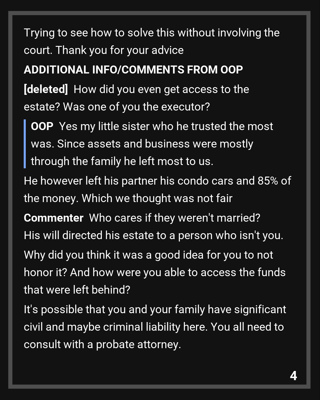 There is a meeting. Objections are raised. The executor is persuaded. The money is divided among relatives. Funeral and medical expenses are paid from the estate. The partner, initially outside the process, later secures a copy of the will and recognizes the discrepancy.