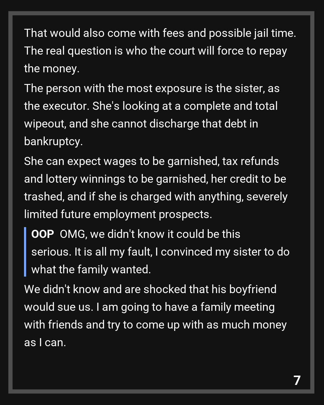 The real question is who the court will force to repay the money. The person with the most exposure is the sister, as the executor. She’s looking at a complete and total wipeout, and she cannot discharge that debt in bankruptcy. She can expect wages to be garnished, tax refunds and lottery winnings to be garnished, her credit to be trashed, and if she is charged with anything, severely limited future employment prospects.