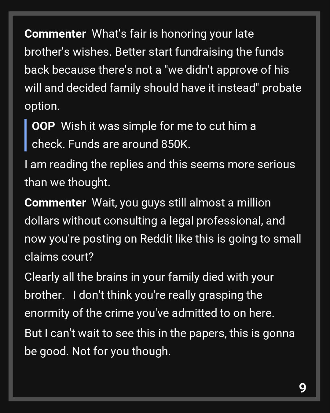 Wait, you guys still almost a million dollars without consulting a legal professional, and now you’re posting on Reddit like this is going to small claims court?