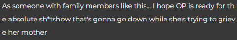 Commenter 5: These are the kind of people who will break into the property and steal any paperwork looking for bank accounts and safety deposit boxes, and dump the closets and mattresses looking for hidden safes. Talk to your mom about distributing any personal gifts before she passes (like giving away jewelry she wants to go to specific grandchildren etc) as Christmas or graduation gifts. Resign yourself to this not ending well, and consider security cameras for your property too.