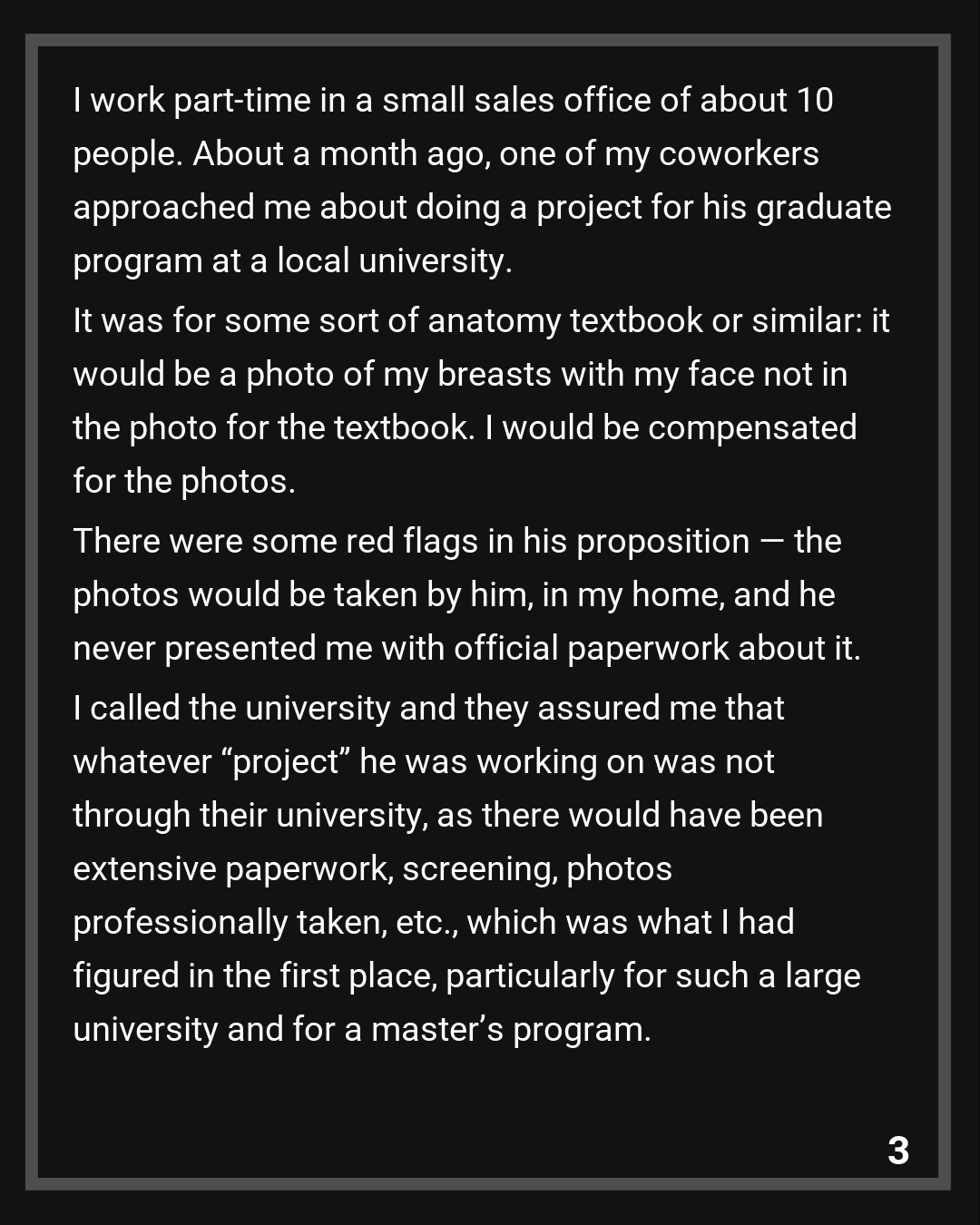 I work part-time in a small sales office of about 10 people. About a month ago, one of my coworkers approached me about doing a project for his graduate program at a local university. It was for some sort of anatomy textbook or similar: it would be a photo of my breasts with my face not in the photo for the textbook. I would be compensated for the photos.