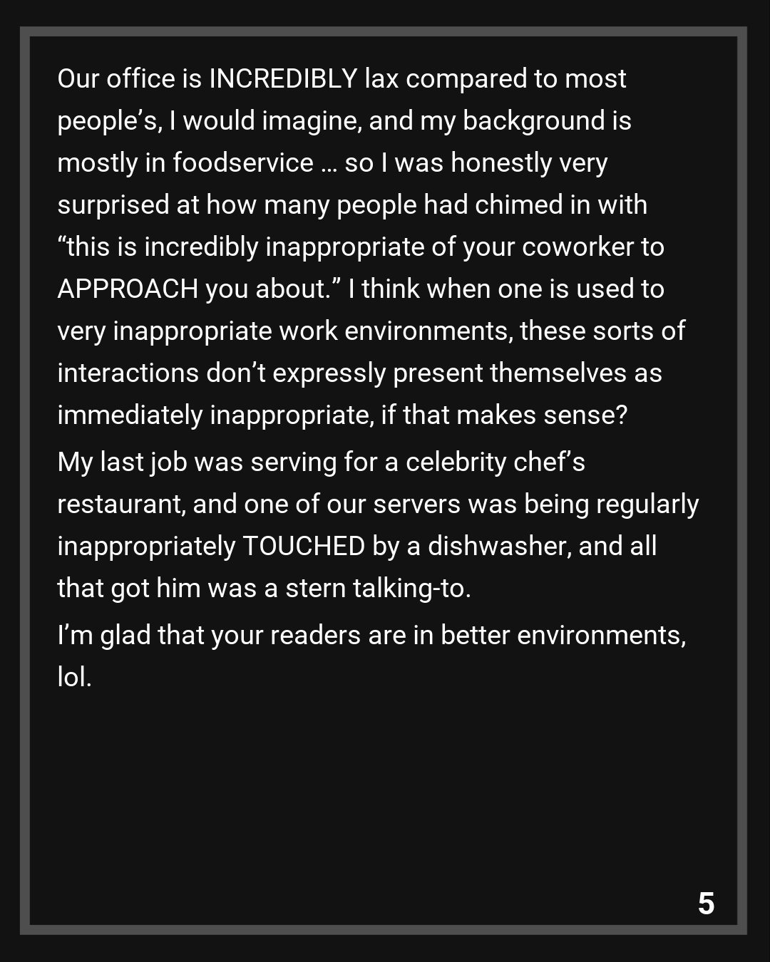 It was kind of emotionally taxing for me to respond to comments, so I didn’t, but I did read most of them. Our office is INCREDIBLY lax compared to most people’s, I would imagine, and my background is mostly in foodservice … so I was honestly very surprised at how many people had chimed in with “this is incredibly inappropriate of your coworker to APPROACH you about.” I think when one is used to very inappropriate work environments, these sorts of interactions don’t expressly present themselves as immediately inappropriate, if that makes sense? My last job was serving for a celebrity chef’s restaurant, and one of our servers was being regularly inappropriately TOUCHED by a dishwasher, and all that got him was a stern talking-to. I’m glad that your readers are in better environments, lol.