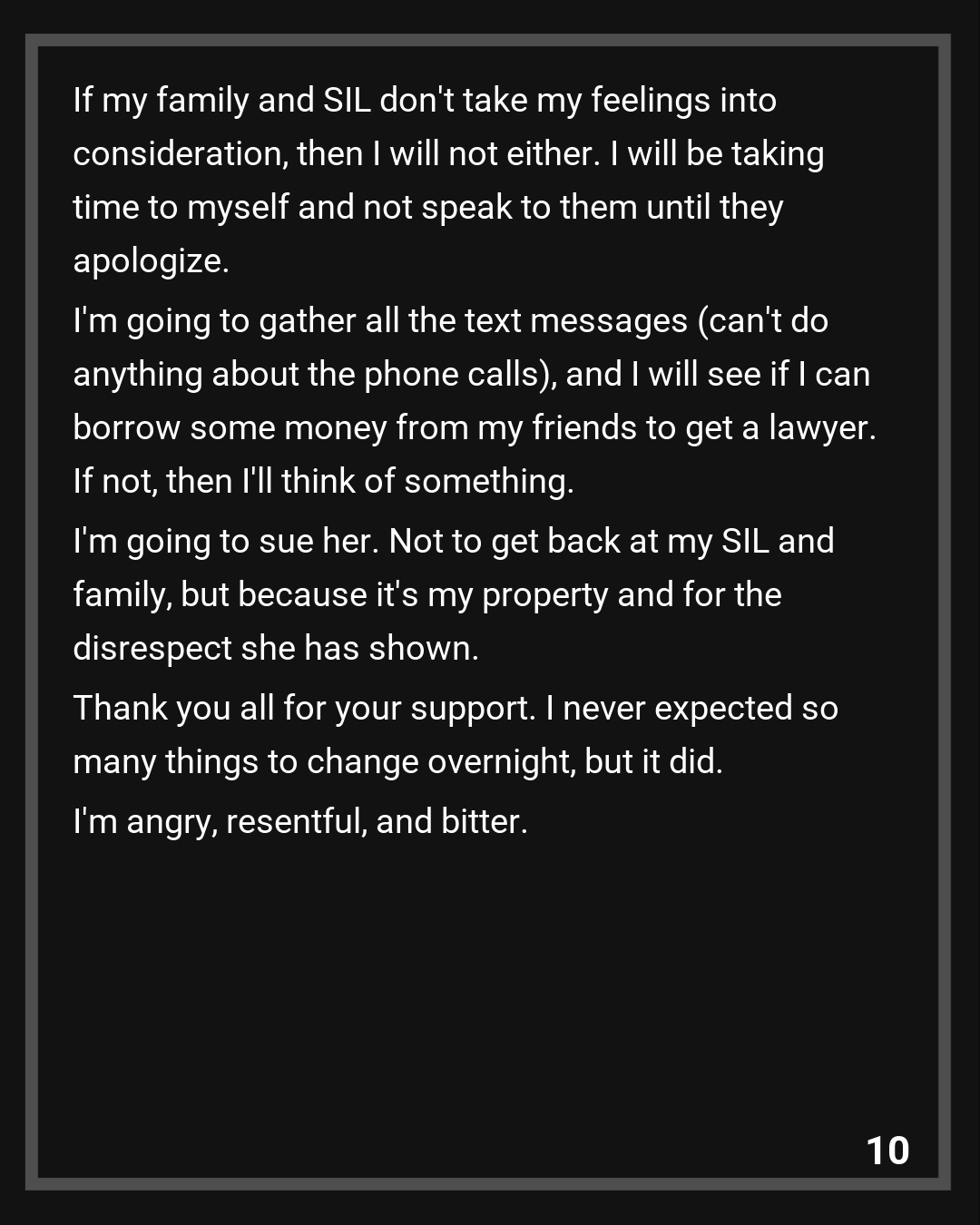 Final update (?): I’ve thought it over, and I’m still thinking about it. I love my brother and my parents, but they are not supportive of me. They don’t care about my feelings because I’m tearing the family apart. My SIL is still very much upset and angry at me, but frankly, I’ve given her a fair compromise. If my family and SIL don’t take my feelings into consideration, then I will not either. I will be taking time to myself and not speak to them until they apologize. I’m going to gather all the text messages (can’t do anything about the phone calls), and I will see if I can borrow some money from my friends to get a lawyer. If not, then I’ll think of something. I’m going to sue her. Not to get back at my SIL and family, but because it’s my property and for the disrespect she has shown.