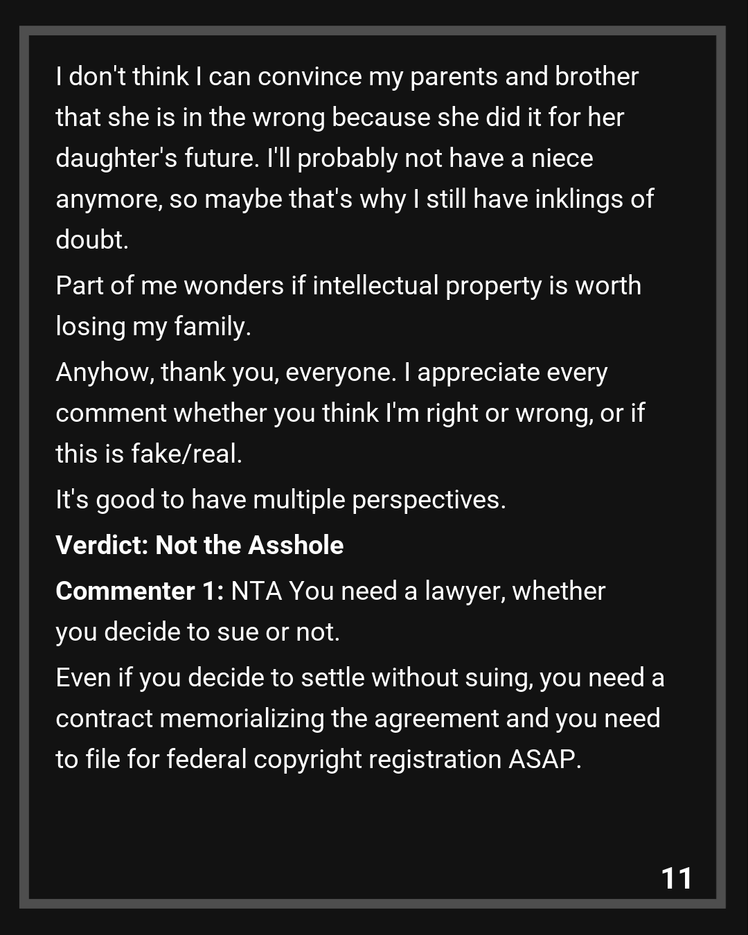 I don’t think I can convince my parents and brother that she is in the wrong because she did it for her daughter’s future. I’ll probably not have a niece anymore, so maybe that’s why I still have inklings of doubt. Part of me wonders if intellectual property is worth losing my family.