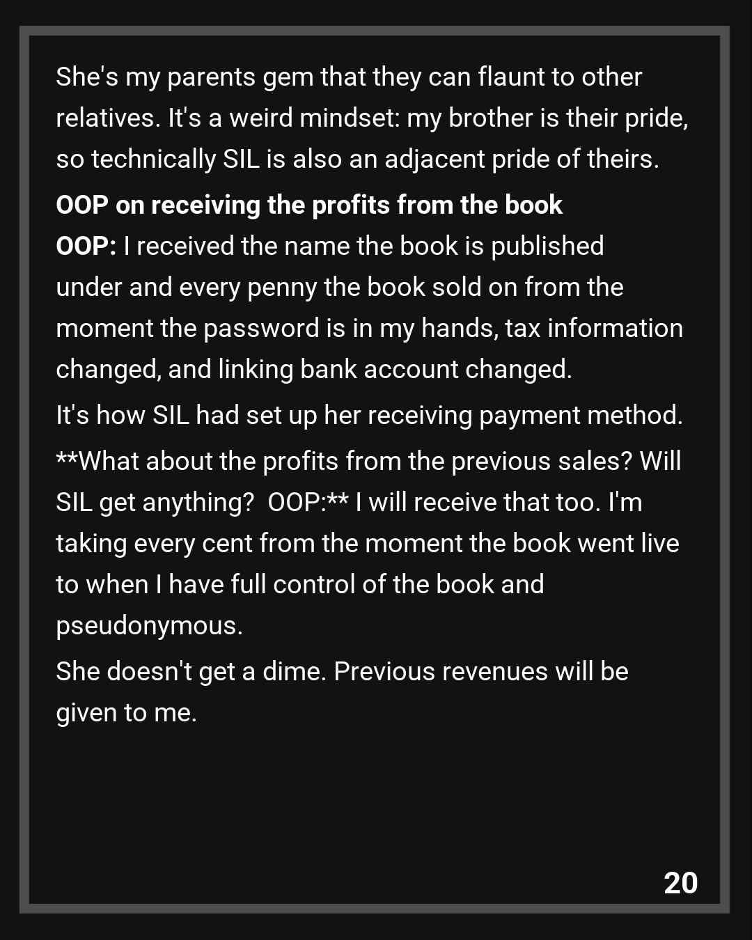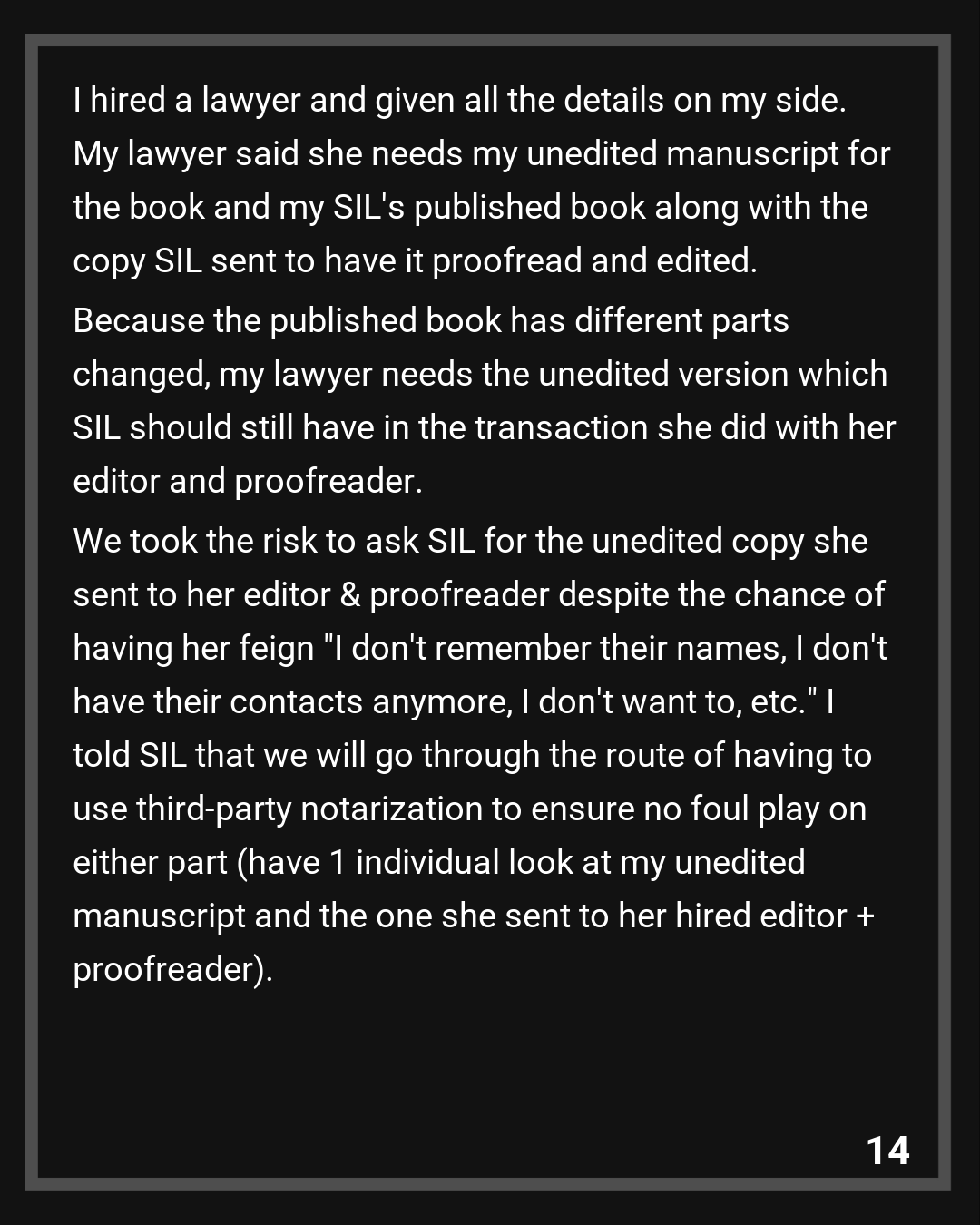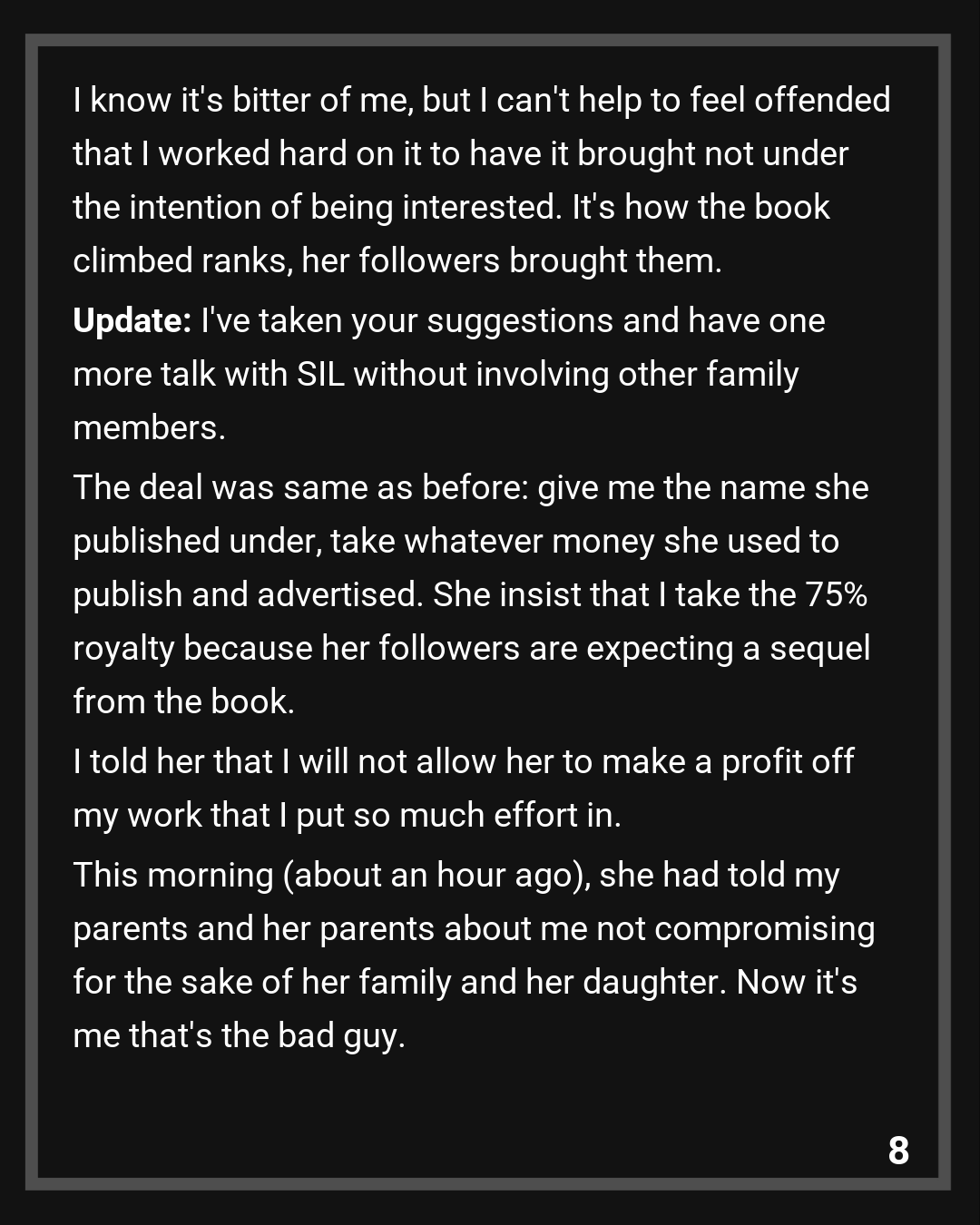 Once I told her that, she must’ve realized I was not bluffing. SIL and my brother accepted the compromise (I take the pseudonym, the royalties: with evidence of sold copies). I stipulated that SIL must put a message out to her followers on her blog that she stole from me and not a single word in the book is hers. I thank the Redditors for suggesting that.