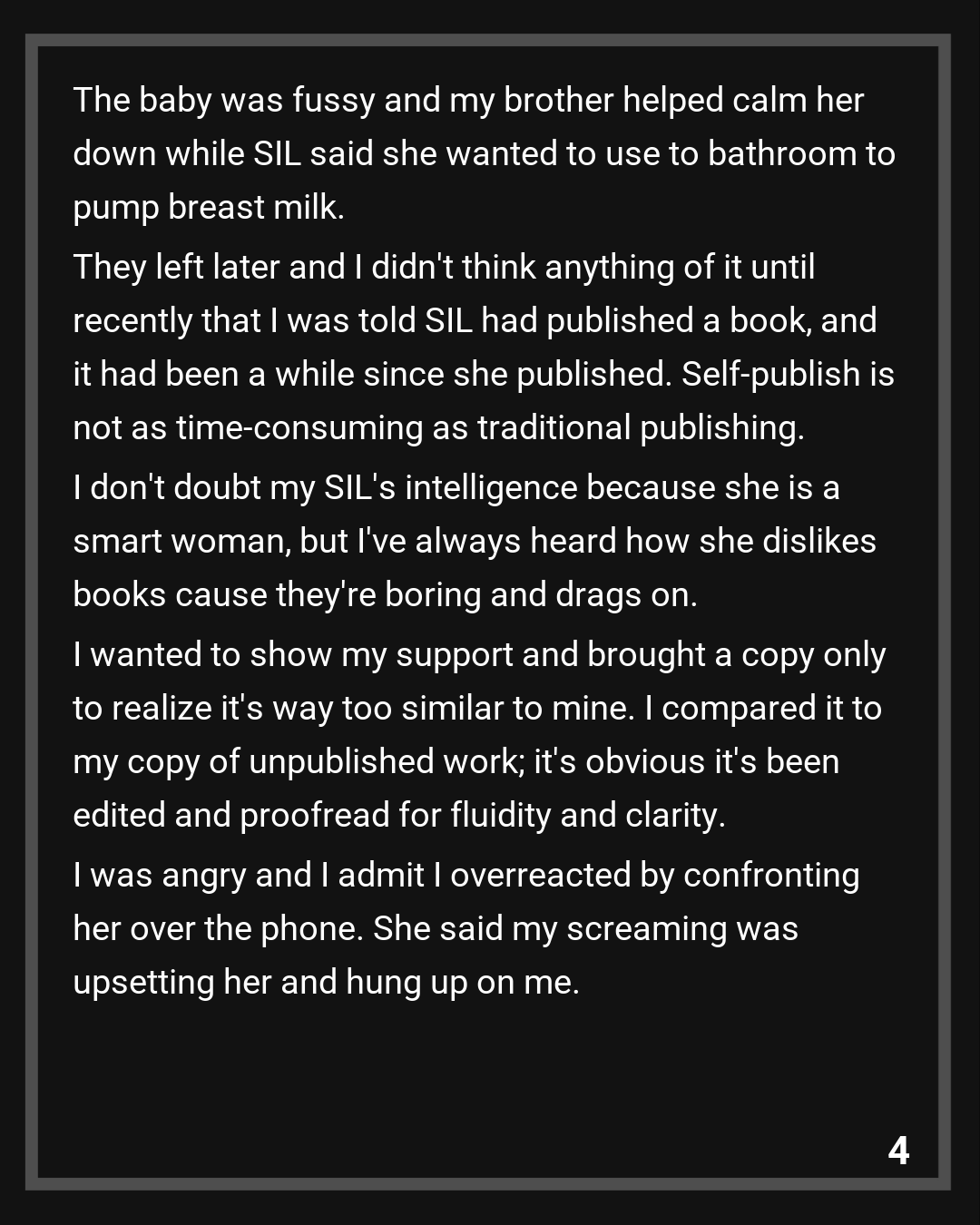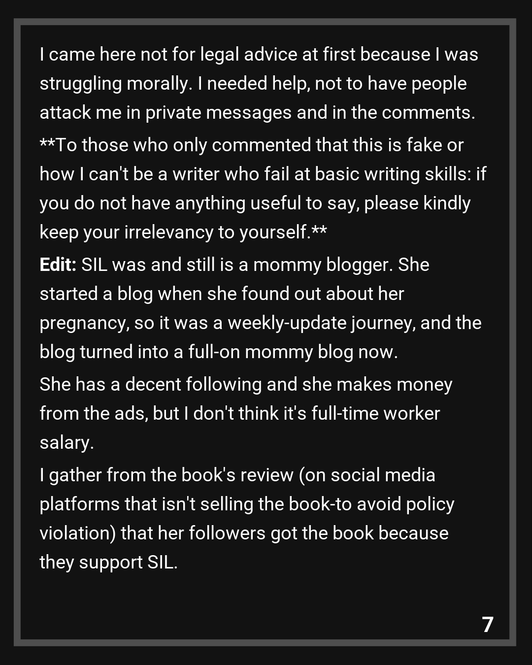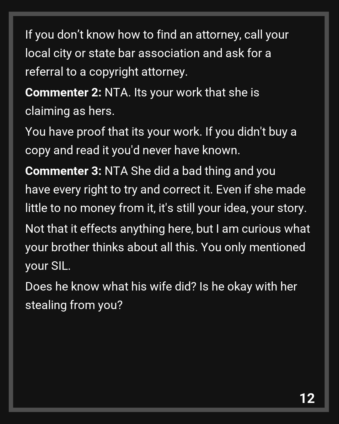Once I told her that, she must’ve realized I was not bluffing. SIL and my brother accepted the compromise (I take the pseudonym, the royalties: with evidence of sold copies). I stipulated that SIL must put a message out to her followers on her blog that she stole from me and not a single word in the book is hers. I thank the Redditors for suggesting that.