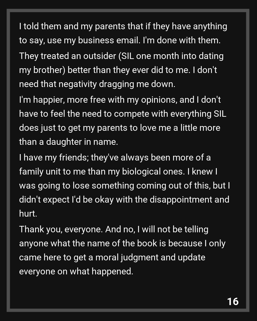 I’m happier, more free with my opinions, and I don’t have to feel the need to compete with everything SIL does just to get my parents to love me a little more than a daughter in name.