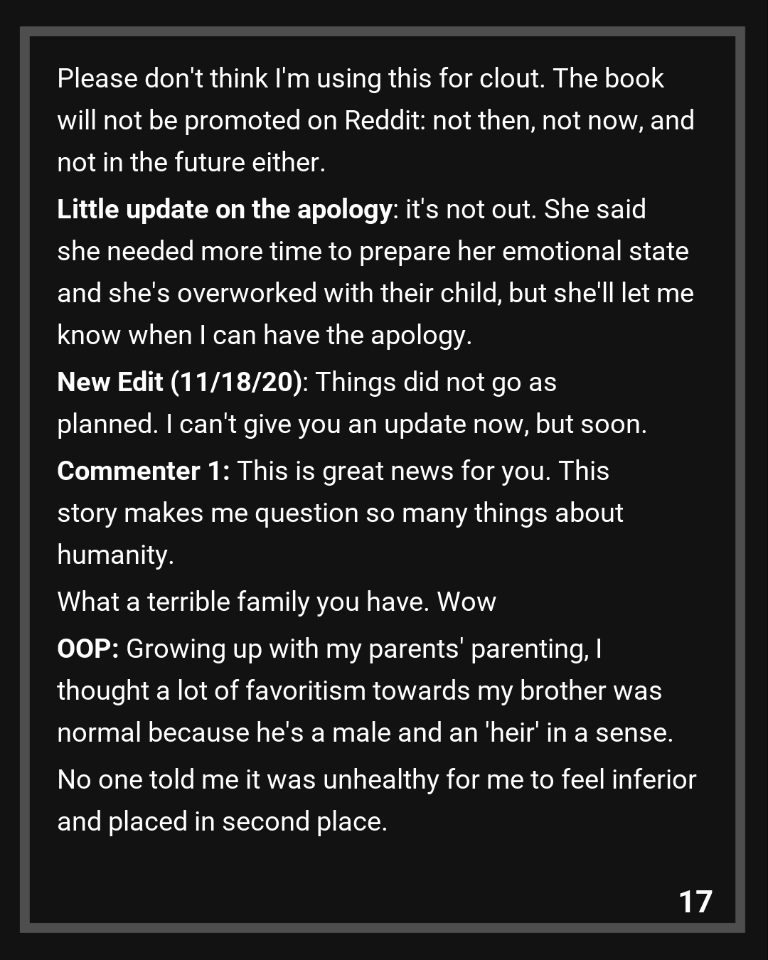 Commenter 1: This is great news for you. This story makes me question so many things about humanity. What a terrible family you have. Wow