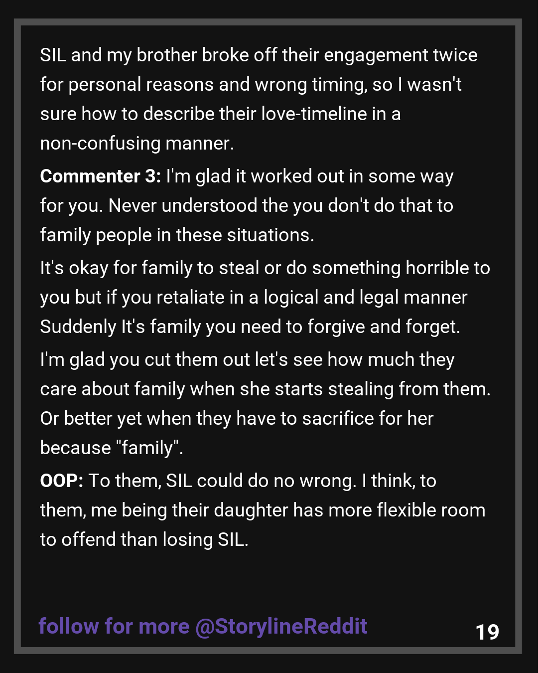 Commenter 3: I’m glad it worked out in some way for you. Never understood the you don’t do that to family people in these situations. It’s okay for family to steal or do something horrible to you but if you retaliate in a logical and legal manner Suddenly It’s family you need to forgive and forget. I’m glad you cut them out let’s see how much they care about family when she starts stealing from them. Or better yet when they have to sacrifice for her because “family”.