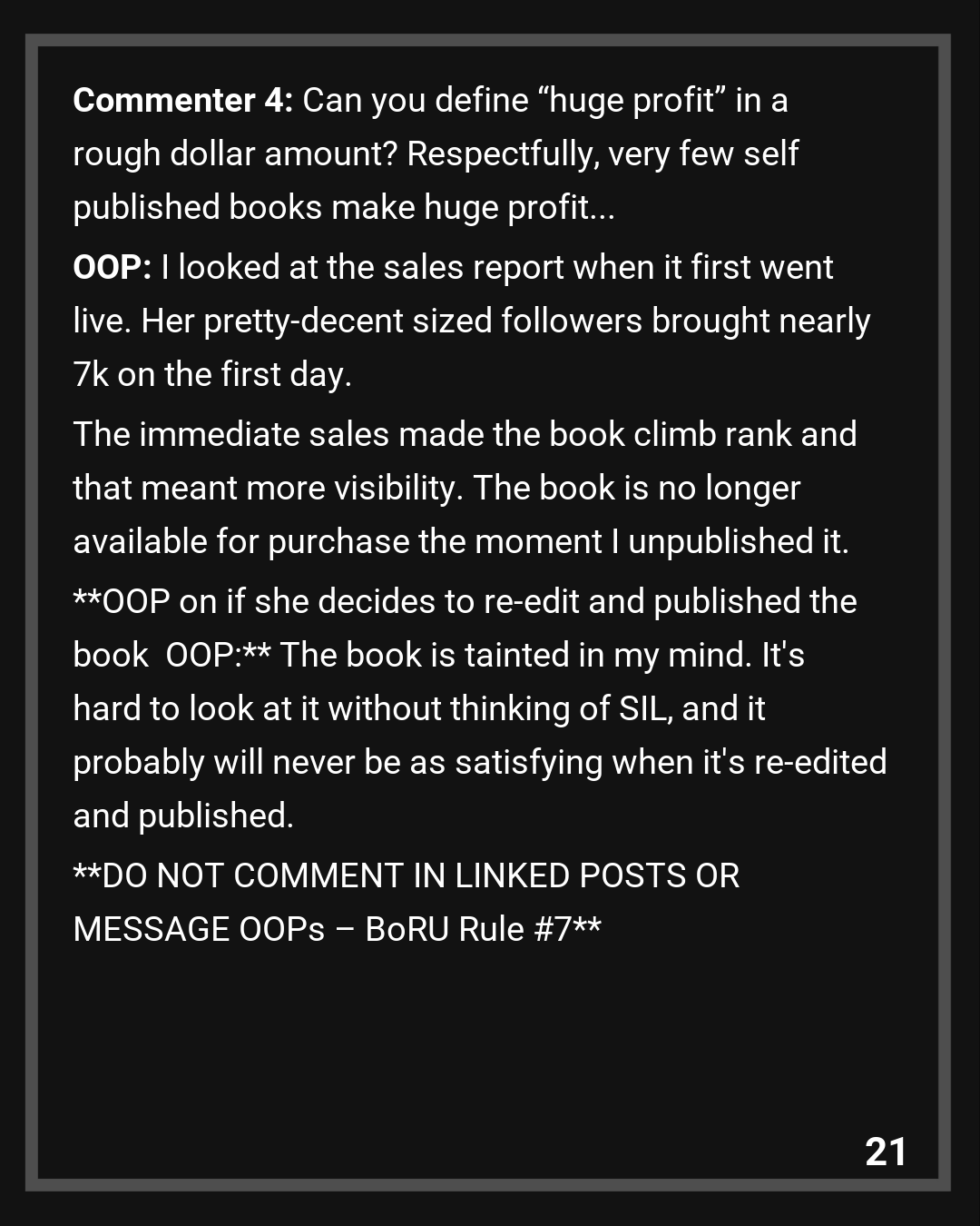 Commenter 4: Can you define “huge profit” in a rough dollar amount? Respectfully, very few self published books make huge profit…