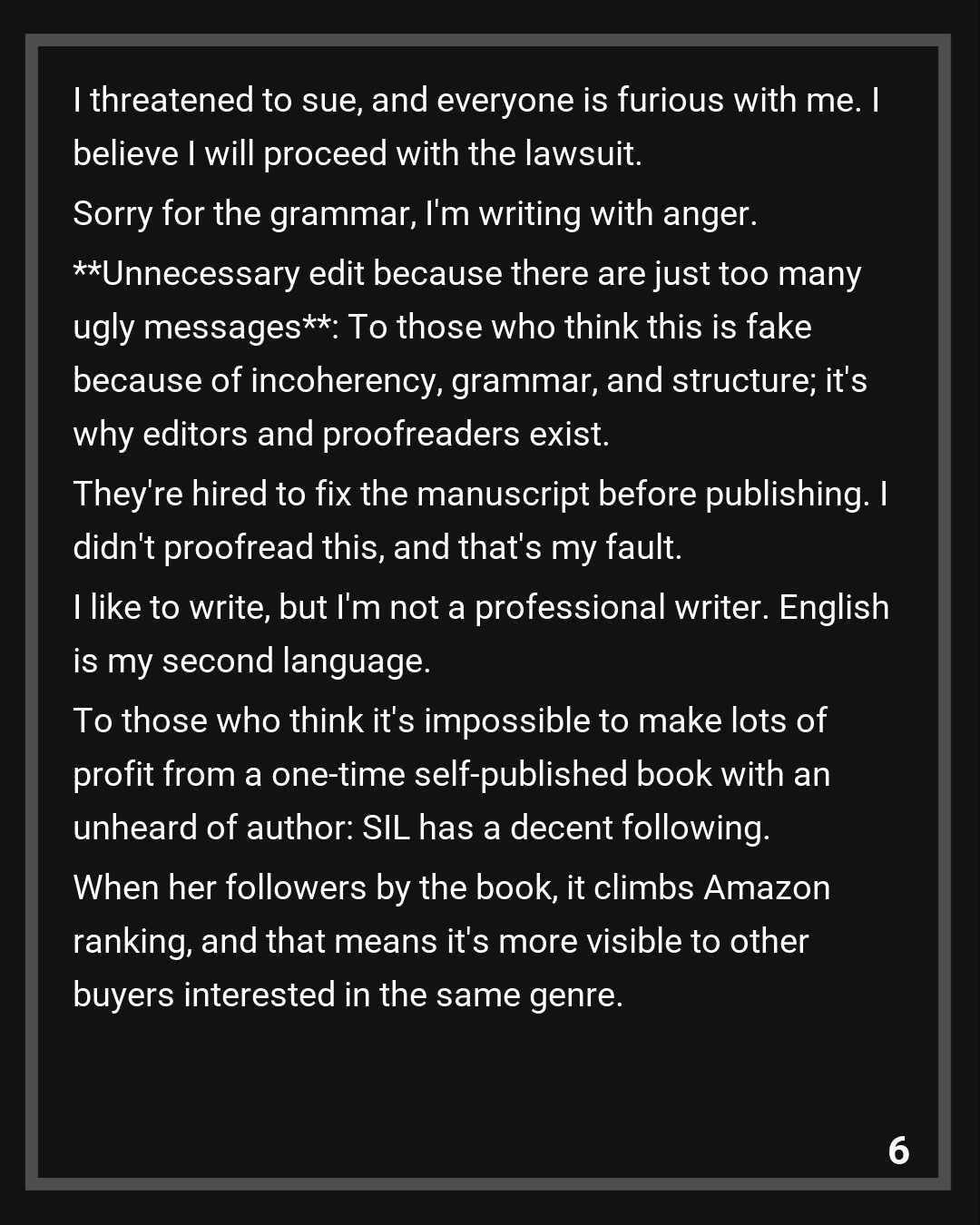 Unnecessary edit because there are just too many ugly messages: To those who think this is fake because of incoherency, grammar, and structure; it’s why editors and proofreaders exist. They’re hired to fix the manuscript before publishing. I didn’t proofread this, and that’s my fault. I like to write, but I’m not a professional writer. English is my second language. To those who think it’s impossible to make lots of profit from a one-time self-published book with an unheard of author: SIL has a decent following. When her followers by the book, it climbs Amazon ranking, and that means it’s more visible to other buyers interested in the same genre.