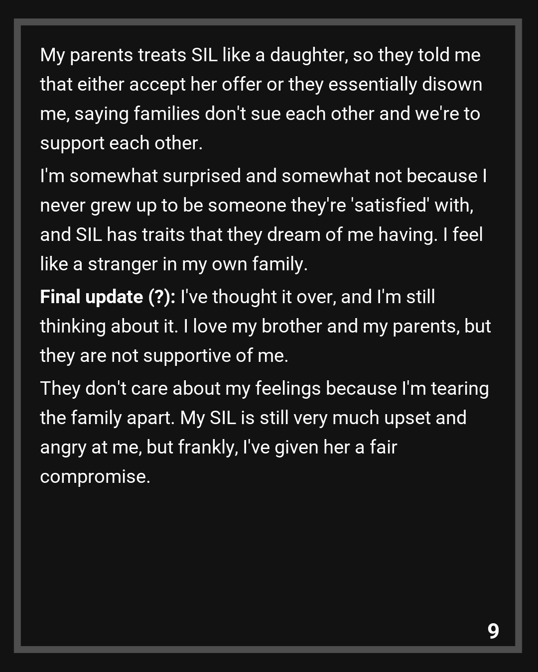OOP: To them, SIL could do no wrong. I think, to them, me being their daughter has more flexible room to offend than losing SIL. She’s my parents gem that they can flaunt to other relatives. It’s a weird mindset: my brother is their pride, so technically SIL is also an adjacent pride of theirs.