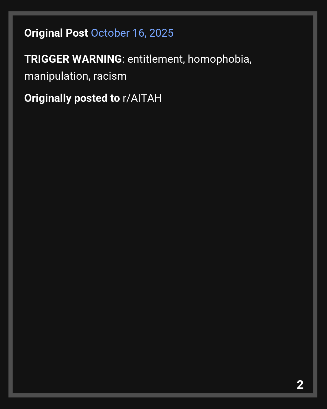 Trigger Warnings: entitlement, homophobia, manipulation, racism