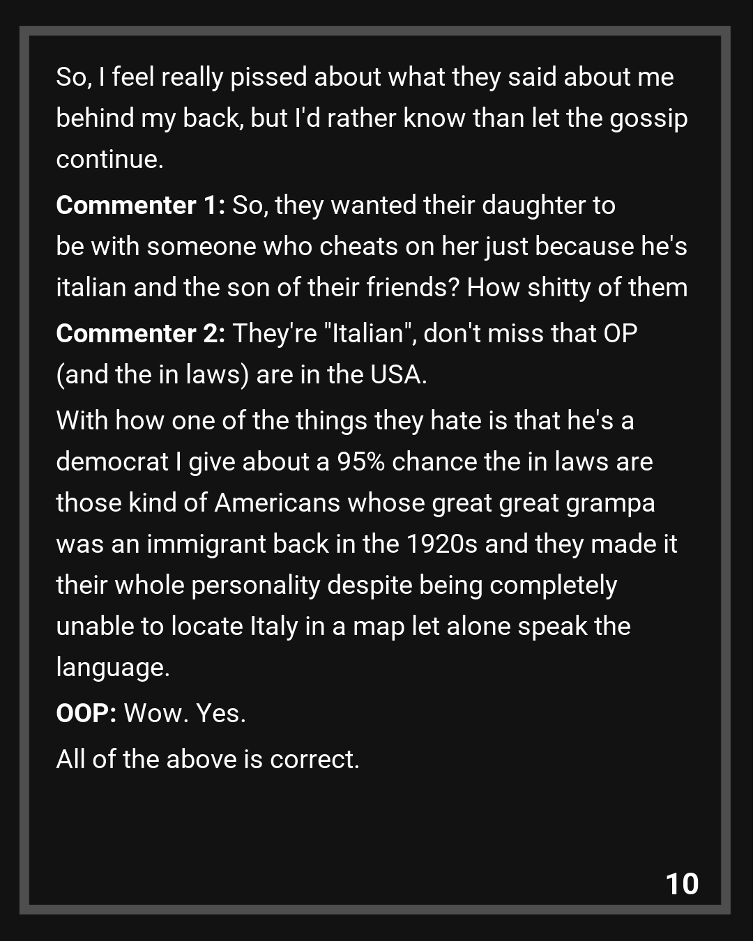 Commenter 2: They’re “Italian”, don’t miss that OP (and the in laws) are in the USA. With how one of the things they hate is that he’s a democrat I give about a 95% chance the in laws are those kind of Americans whose great great grampa was an immigrant back in the 1920s and they made it their whole personality despite being completely unable to locate Italy in a map let alone speak the language.