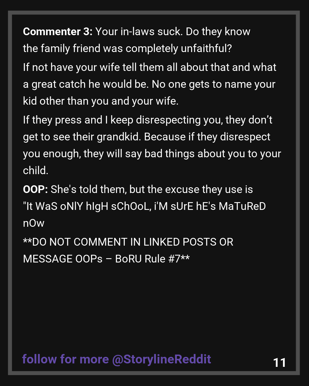 Commenter 3: Your in-laws suck. Do they know the family friend was completely unfaithful? If not have your wife tell them all about that and what a great catch he would be. No one gets to name your kid other than you and your wife. If they press and I keep disrespecting you, they don’t get to see their grandkid. Because if they disrespect you enough, they will say bad things about you to your child.