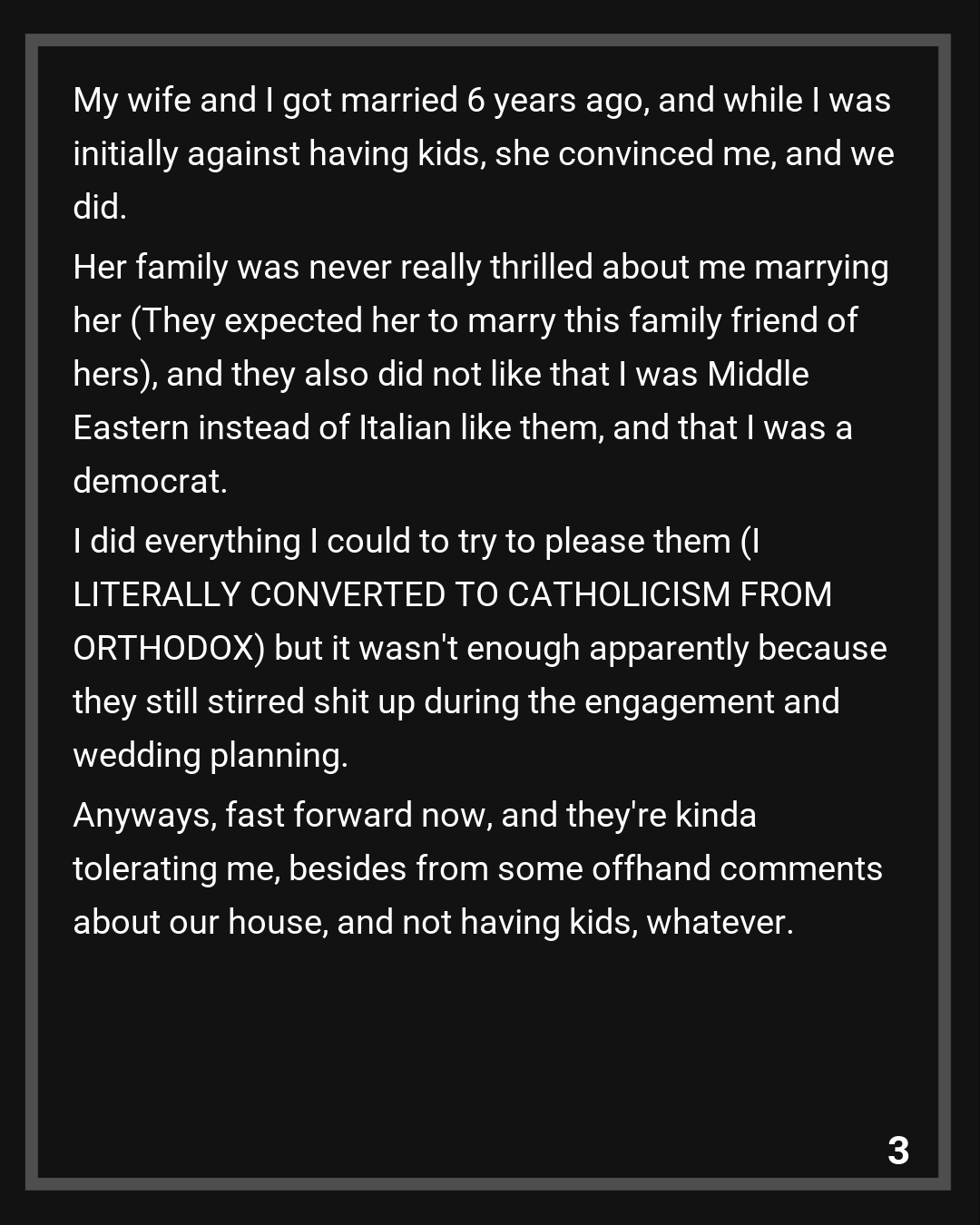 My wife and I got married 6 years ago, and while I was initially against having kids, she convinced me, and we did. Her family was never really thrilled about me marrying her (They expected her to marry this family friend of hers), and they also did not like that I was Middle Eastern instead of Italian like them, and that I was a democrat. I did everything I could to try to please them (I LITERALLY CONVERTED TO CATHOLICISM FROM ORTHODOX) but it wasn’t enough apparently because they still stirred shit up during the engagement and wedding planning. Anyways, fast forward now, and they’re kinda tolerating me, besides from some offhand comments about our house, and not having kids, whatever.