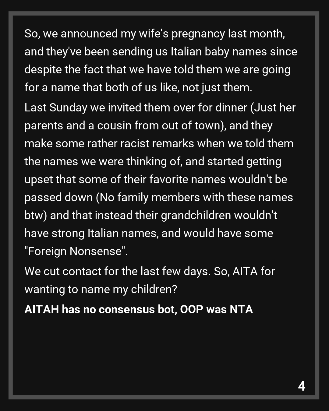 So, we announced my wife’s pregnancy last month, and they’ve been sending us Italian baby names since despite the fact that we have told them we are going for a name that both of us like, not just them. Last Sunday we invited them over for dinner (Just her parents and a cousin from out of town), and they make some rather racist remarks when we told them the names we were thinking of, and started getting upset that some of their favorite names wouldn’t be passed down (No family members with these names btw) and that instead their grandchildren wouldn’t have strong Italian names, and would have some “Foreign Nonsense”. We cut contact for the last few days. So, AITA for wanting to name my children?