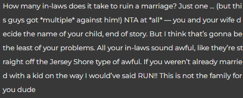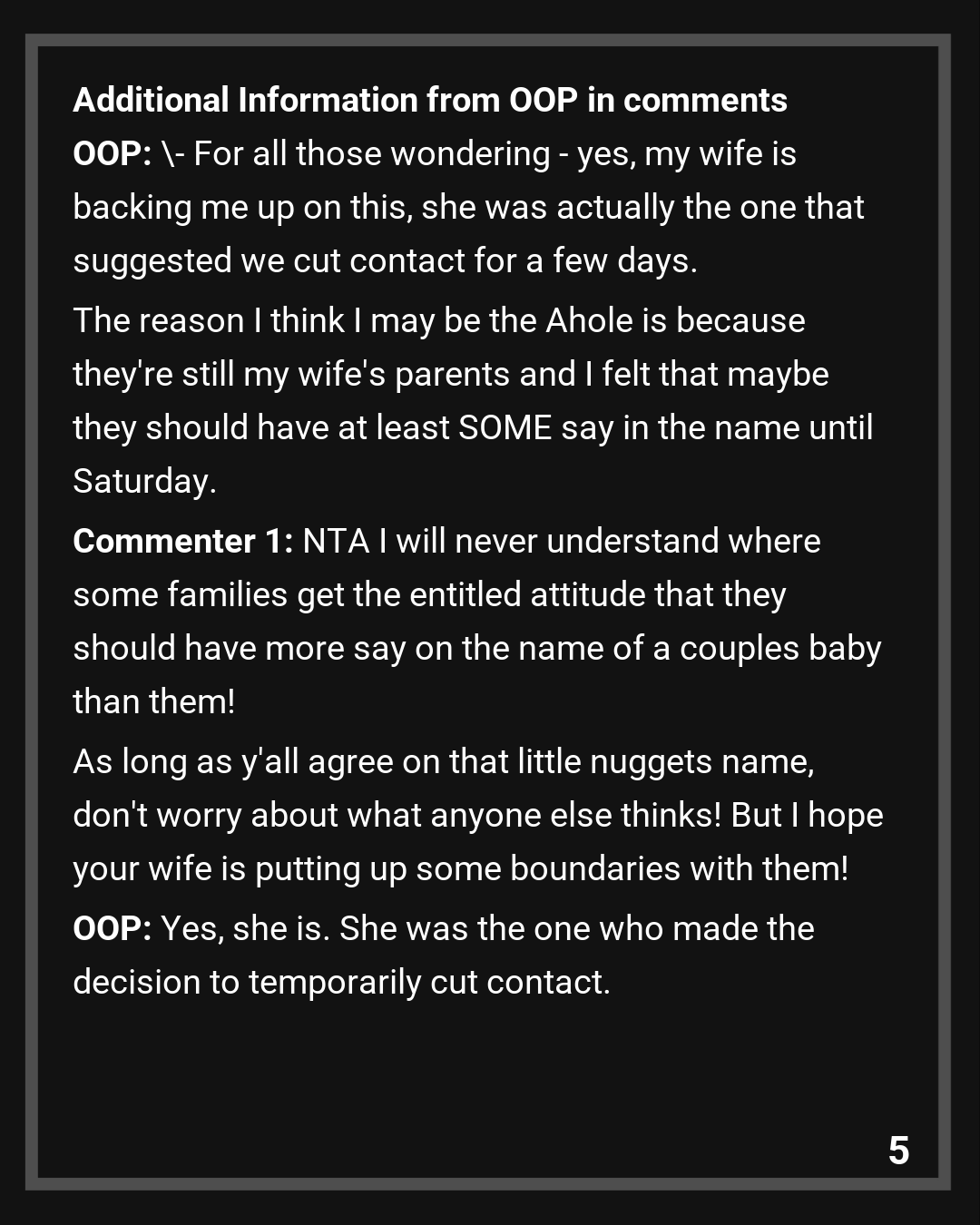 Commenter 1: NTA I will never understand where some families get the entitled attitude that they should have more say on the name of a couples baby than them! As long as y’all agree on that little nuggets name, don’t worry about what anyone else thinks! But I hope your wife is putting up some boundaries with them! Congrats!