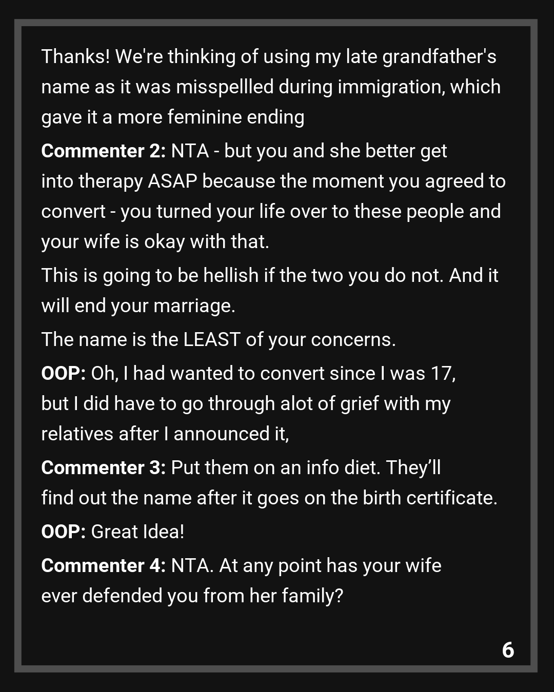 Commenter 2: NTA – but you and she better get into therapy ASAP because the moment you agreed to convert – you turned your life over to these people and your wife is okay with that. This is going to be hellish if the two you do not. And it will end your marriage. The name is the LEAST of your concerns.