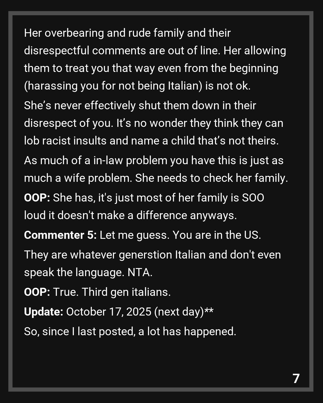 Commenter 4: NTA. At any point has your wife ever defended you from her family? Her overbearing and rude family and their disrespectful comments are out of line. Her allowing them to treat you that way even from the beginning (harassing you for not being Italian) is not ok. She’s never effectively shut them down in their disrespect of you. It’s no wonder they think they can lob racist insults and name a child that’s not theirs. As much of a in-law problem you have this is just as much a wife problem. She needs to check her family.