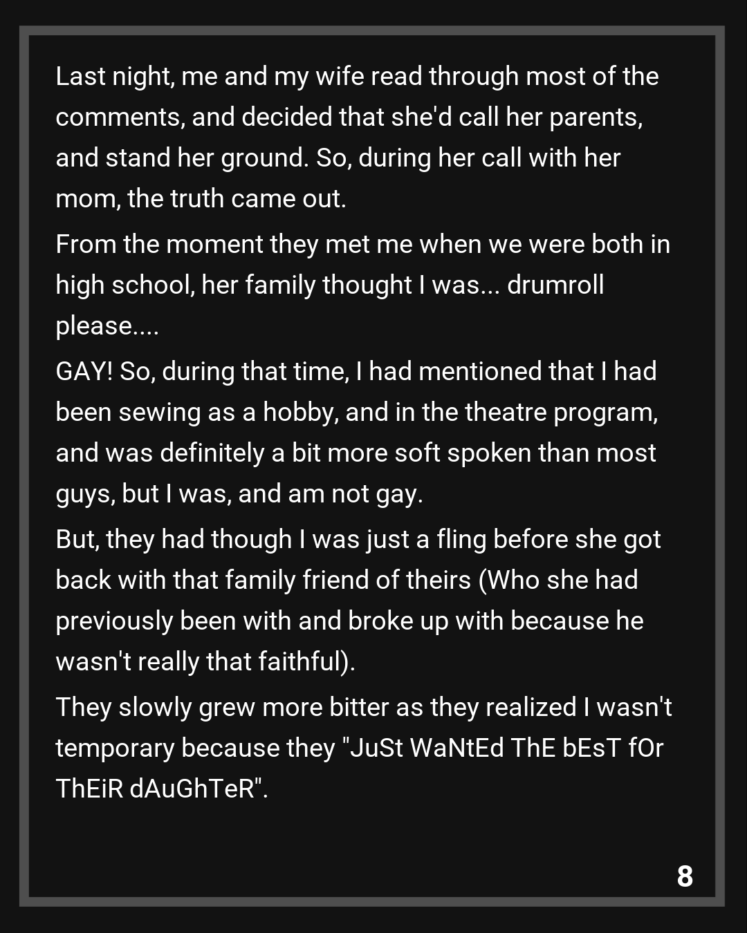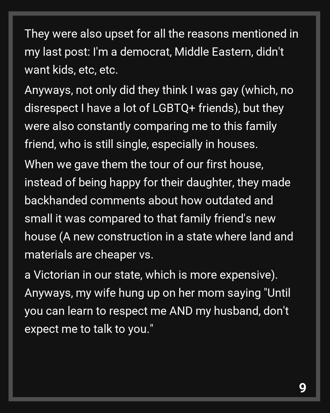 Anyways, not only did they think I was gay (which, no disrespect I have a lot of LGBTQ+ friends), but they were also constantly comparing me to this family friend, who is still single, especially in houses. When we gave them the tour of our first house, instead of being happy for their daughter, they made backhanded comments about how outdated and small it was compared to that family friend’s new house (A new construction in a state where land and materials are cheaper vs. a Victorian in our state, which is more expensive). Anyways, my wife hung up on her mom saying “Until you can learn to respect me AND my husband, don’t expect me to talk to you.”