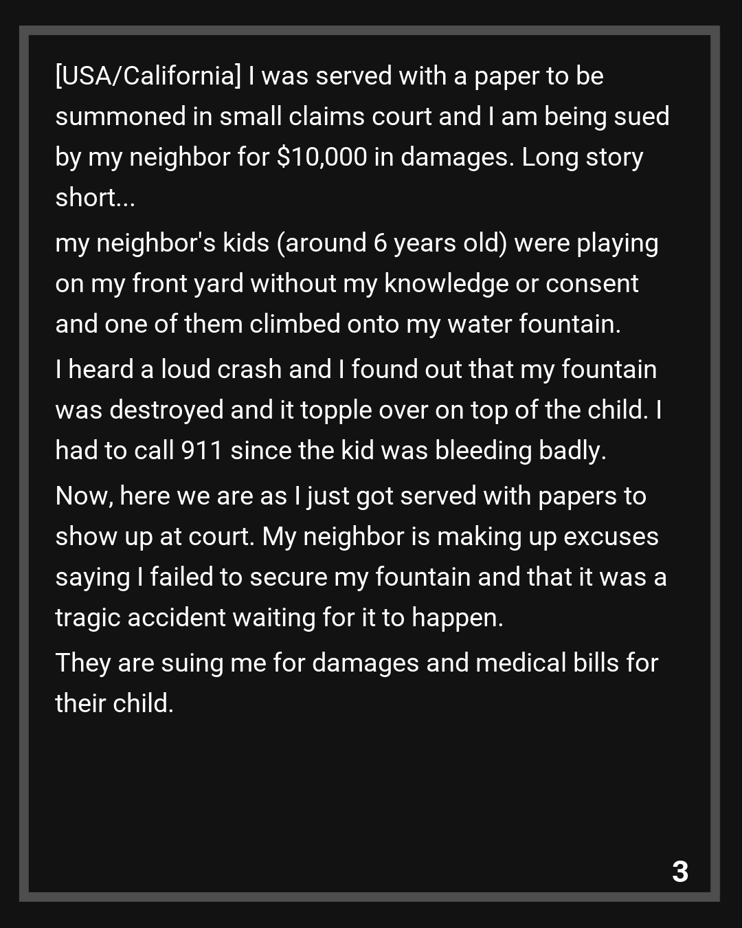 Now, here we are as I just got served with papers to show up at court. My neighbor is making up excuses saying I failed to secure my fountain and that it was a tragic accident waiting for it to happen. They are suing me for damages and medical bills for their child.
