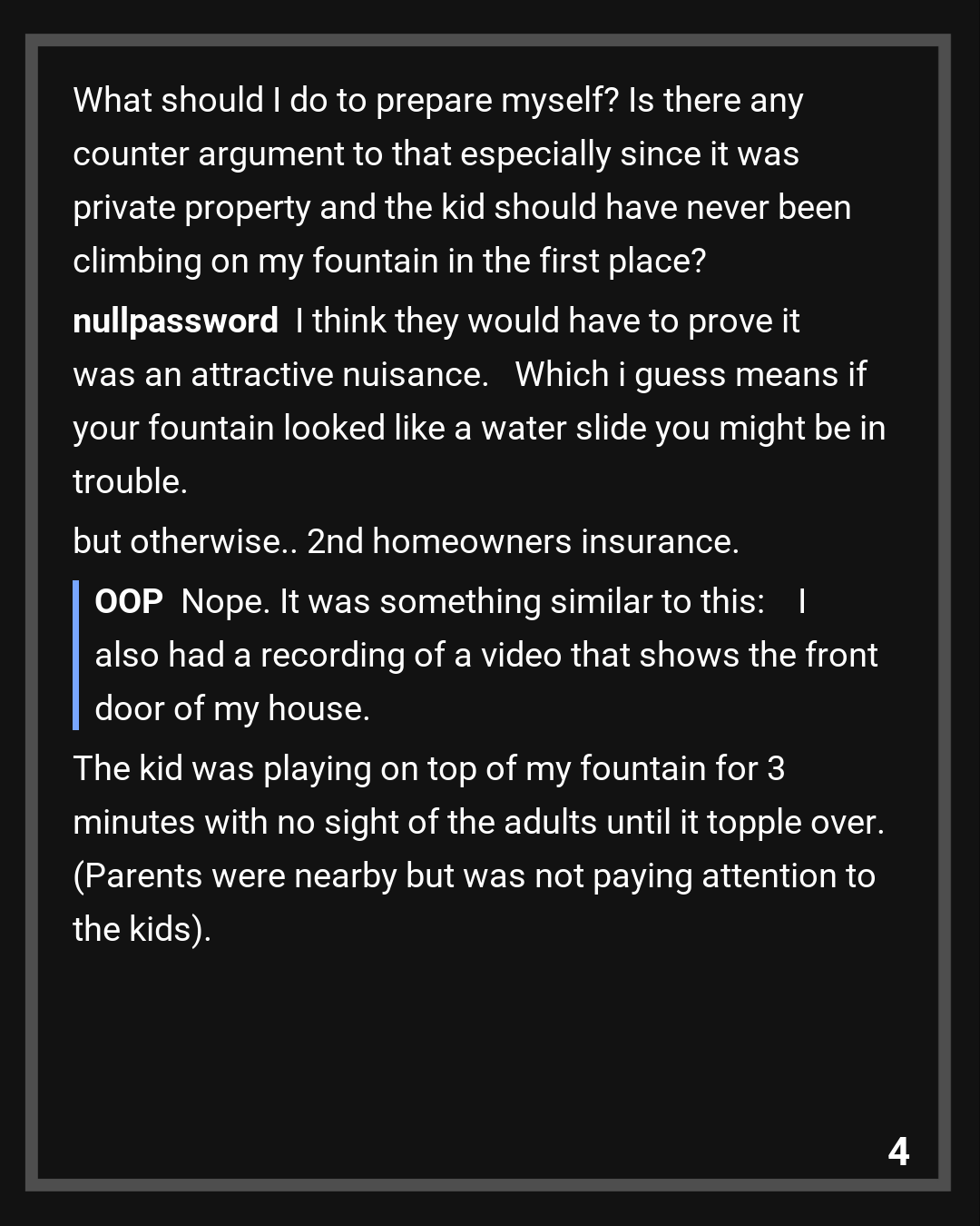 I also had a recording of a video that shows the front door of my house. The kid was playing on top of my fountain for 3 minutes with no sight of the adults until it topple over. (Parents were nearby but was not paying attention to the kids). Maybe this video would help me claim that the adult should have enough time and warning to tell their kids to not climb on top of the fountain?