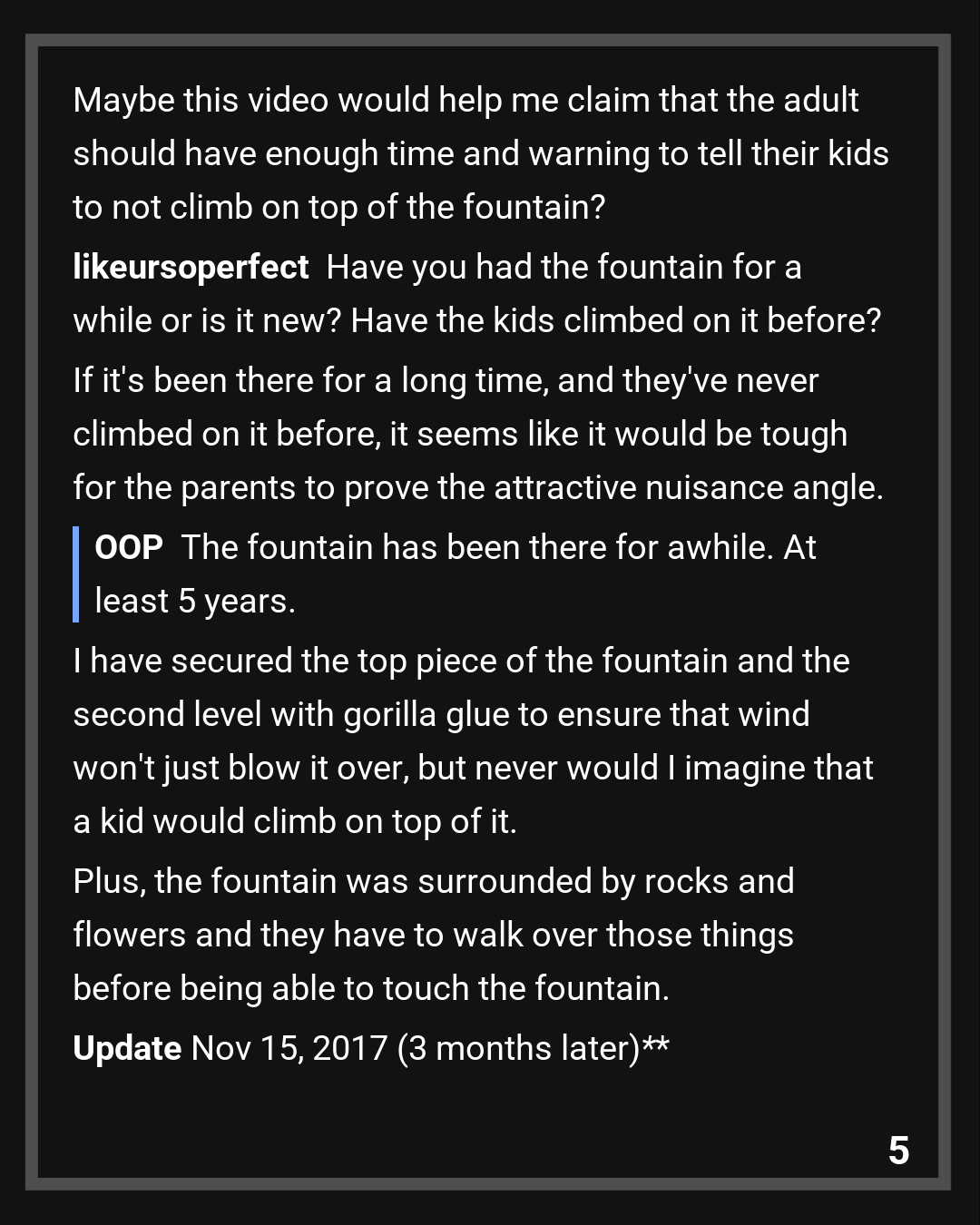 The judge concluded that I was not responsible for injuring my neighbor’s kid and that the fountain was properly secured to the best of my ability. I also showed him the video of the kid playing on top of the fountain before it fell. Judge told the parents that ultimately it was their responsibility to look after their kid especially when the video showed over 3 minutes of the kid playing on top of the fountain before the collapse. They knew their kids were playing on the fountain and they did not tell them to stop.