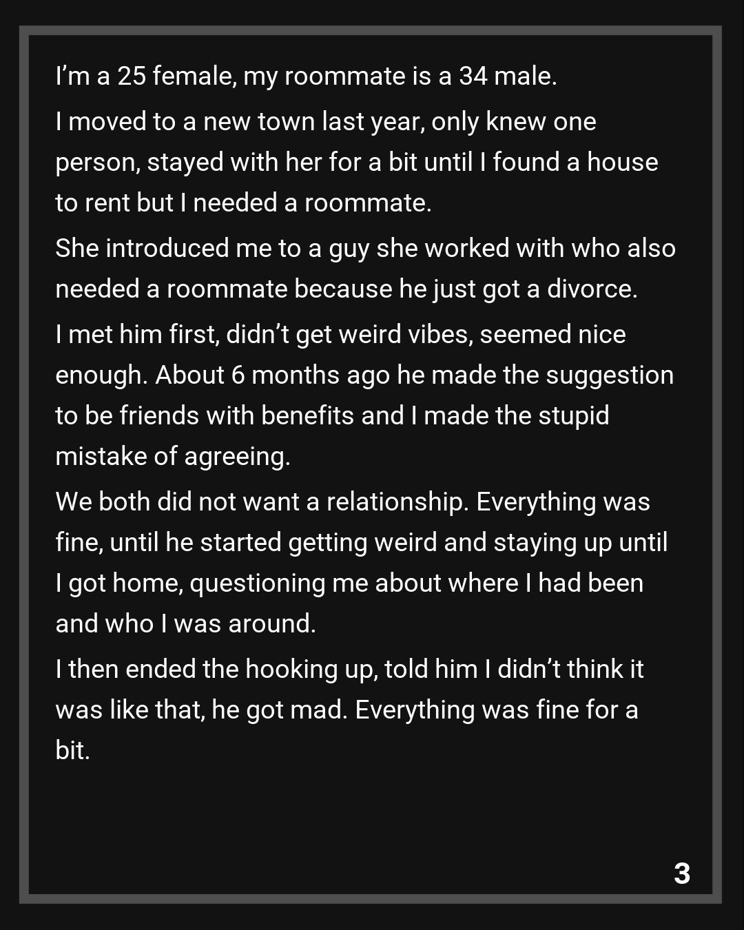 I met him first, didn’t get weird vibes, seemed nice enough. About 6 months ago he made the suggestion to be friends with benefits and I made the stupid mistake of agreeing. We both did not want a relationship. Everything was fine, until he started getting weird and staying up until I got home, questioning me about where I had been and who I was around. I then ended the hooking up, told him I didn’t think it was like that, he got mad. Everything was fine for a bit. Until yesterday.