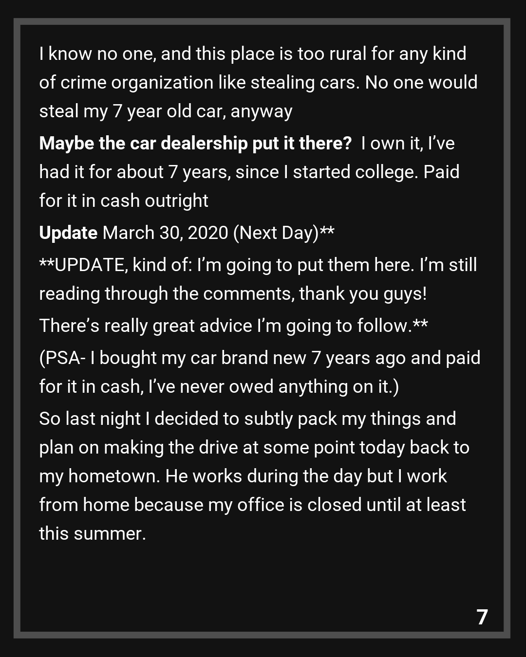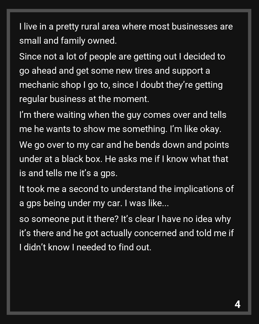 I live in a pretty rural area where most businesses are small and family owned. Since not a lot of people are getting out I decided to go ahead and get some new tires and support a mechanic shop I go to, since I doubt they’re getting regular business at the moment. I’m there waiting when the guy comes over and tells me he wants to show me something. I’m like okay. We go over to my car and he bends down and points under at a black box. He asks me if I know what that is and tells me it’s a gps. It took me a second to understand the implications of a gps being under my car. I was like… so someone put it there? It’s clear I have no idea why it’s there and he got actually concerned and told me if I didn’t know I needed to find out.