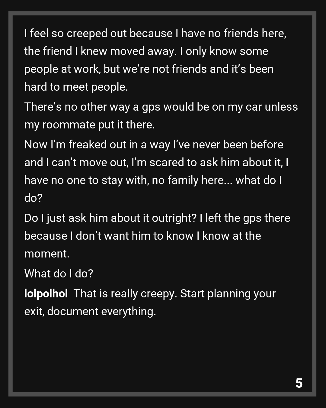 I feel so creeped out because I have no friends here, the friend I knew moved away. I only know some people at work, but we’re not friends and it’s been hard to meet people. There’s no other way a gps would be on my car unless my roommate put it there. Now I’m freaked out in a way I’ve never been before and I can’t move out, I’m scared to ask him about it, I have no one to stay with, no family here… what do I do? Do I just ask him about it outright? I left the gps there because I don’t want him to know I know at the moment. What do I do?