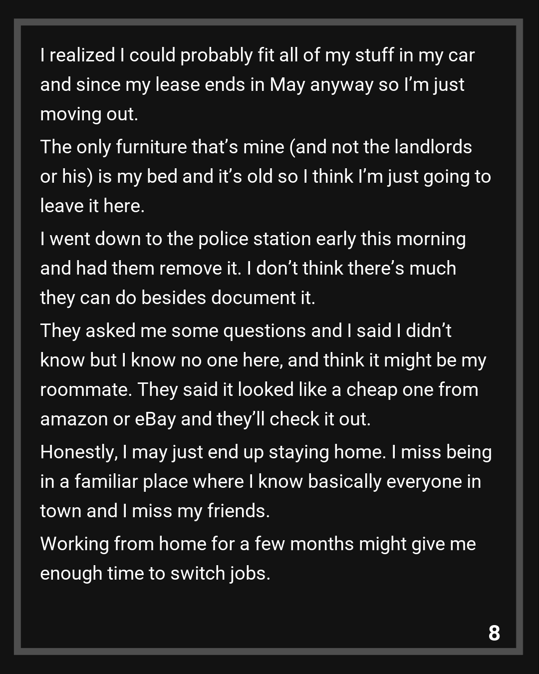 So last night I decided to subtly pack my things and plan on making the drive at some point today back to my hometown. He works during the day but I work from home because my office is closed until at least this summer. I realized I could probably fit all of my stuff in my car and since my lease ends in May anyway so I’m just moving out. The only furniture that’s mine (and not the landlords or his) is my bed and it’s old so I think I’m just going to leave it here.