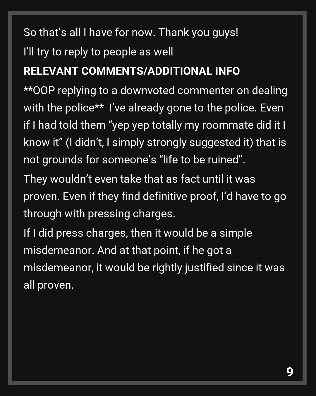 I’ve already gone to the police. Even if I had told them “yep yep totally my roommate did it I know it” (I didn’t, I simply strongly suggested it) that is not grounds for someone’s “life to be ruined”. They wouldn’t even take that as fact until it was proven. Even if they find definitive proof, I’d have to go through with pressing charges. If I did press charges, then it would be a simple misdemeanor. And at that point, if he got a misdemeanor, it would be rightly justified since it was all proven. And that’s if I would even bother with charges in the first place. All of this minor things compared to if he was an insane loose cannon that could kill/hurt me if I just didn’t mention his name.