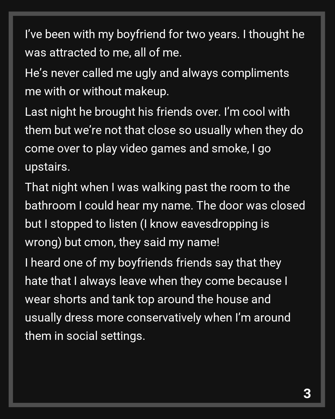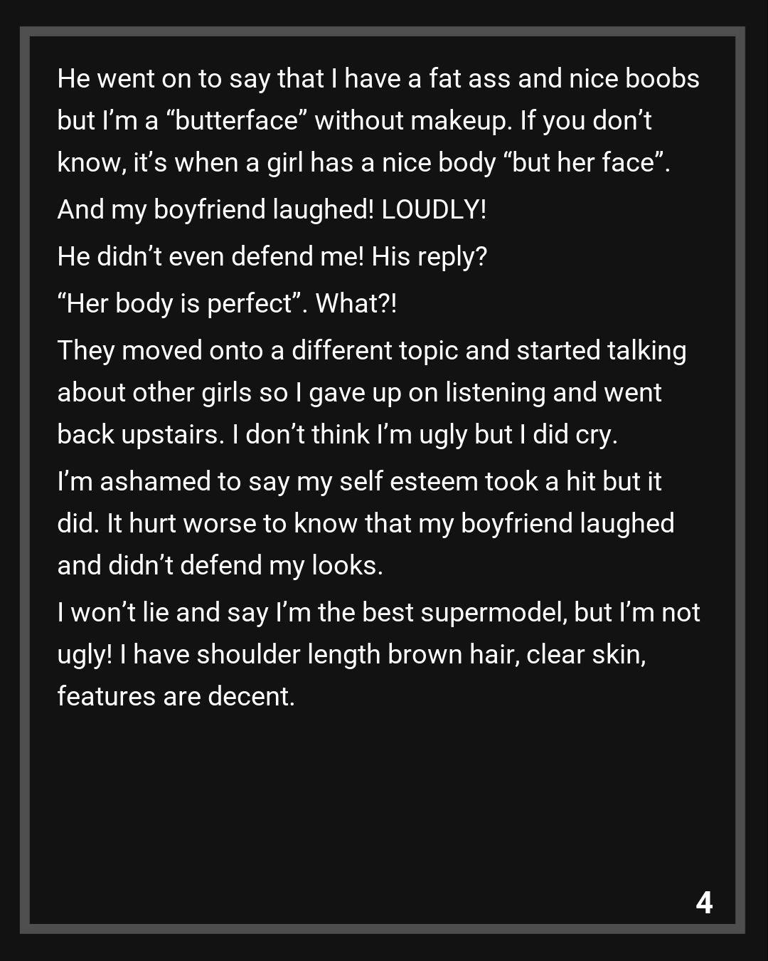 I heard one of my boyfriends friends say that they hate that I always leave when they come because I wear shorts and tank top around the house and usually dress more conservatively when I’m around them in social settings. He went on to say that I have a fat ass and nice boobs but I’m a “butterface” without makeup. If you don’t know, it’s when a girl has a nice body “but her face”.