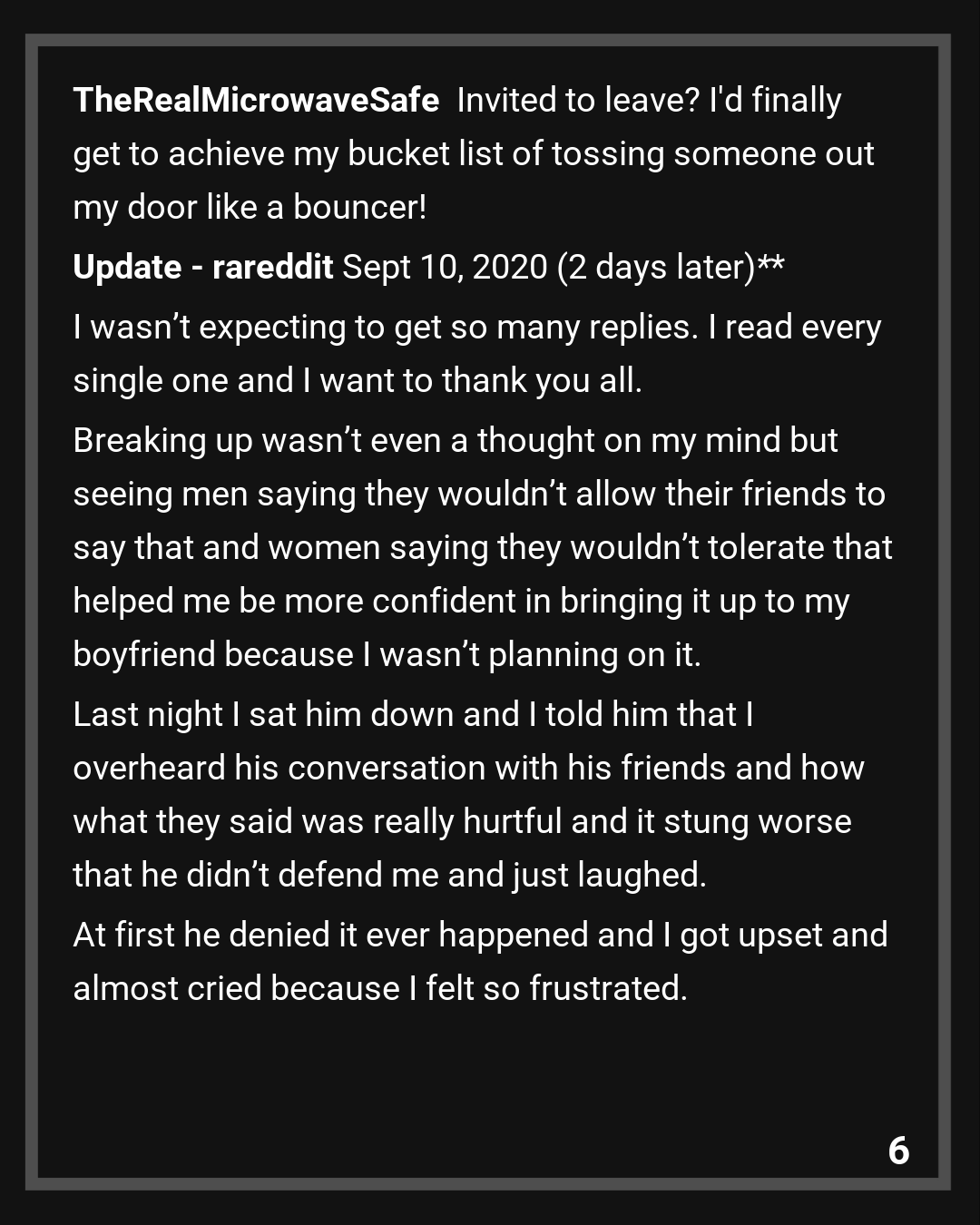I wasn’t expecting to get so many replies. I read every single one and I want to thank you all. Breaking up wasn’t even a thought on my mind but seeing men saying they wouldn’t allow their friends to say that and women saying they wouldn’t tolerate that helped me be more confident in bringing it up to my boyfriend because I wasn’t planning on it.