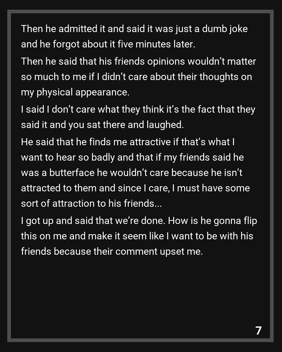 Then he admitted it and said it was just a dumb joke and he forgot about it five minutes later. Then he said that his friends opinions wouldn’t matter so much to me if I didn’t care about their thoughts on my physical appearance. I said I don’t care what they think it’s the fact that they said it and you sat there and laughed. He said that he finds me attractive if that’s what I want to hear so badly and that if my friends said he was a butterface he wouldn’t care because he isn’t attracted to them and since I care, I must have some sort of attraction to his friends…