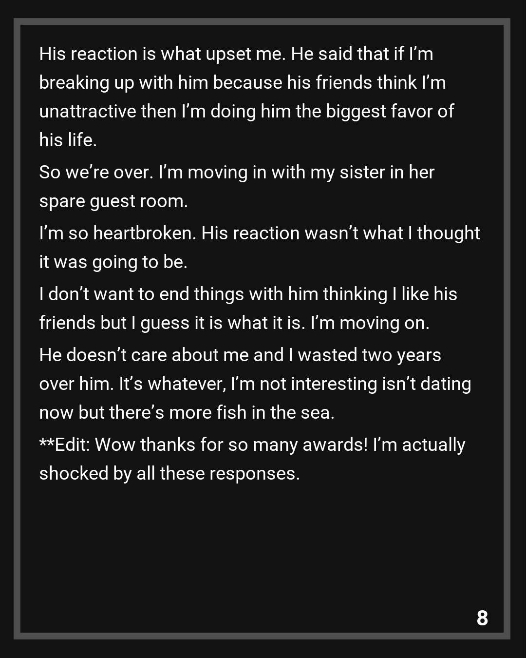 I got up and said that we’re done. How is he gonna flip this on me and make it seem like I want to be with his friends because their comment upset me. His reaction is what upset me. He said that if I’m breaking up with him because his friends think I’m unattractive then I’m doing him the biggest favor of his life.