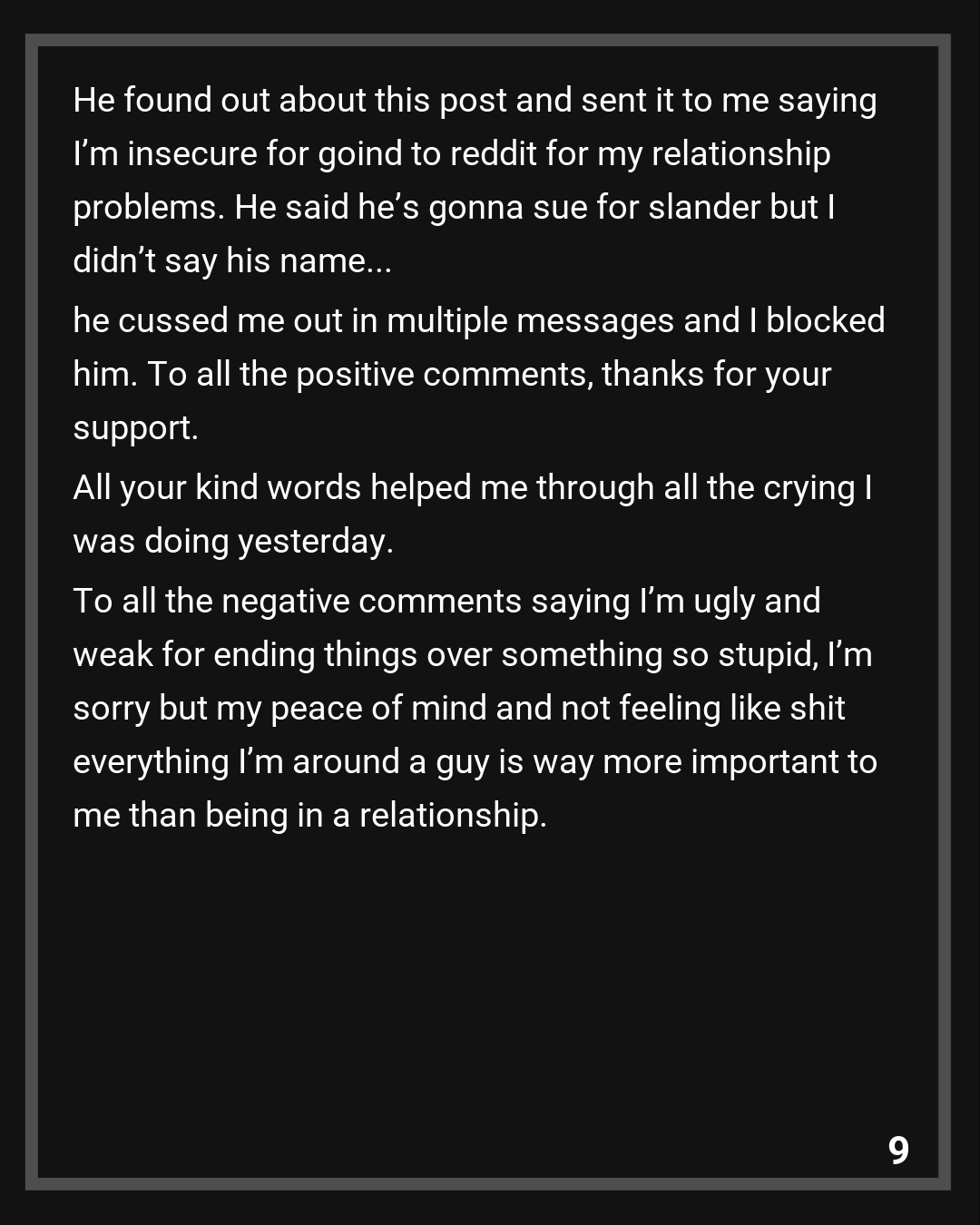 Edit: Wow thanks for so many awards! I’m actually shocked by all these responses. He found out about this post and sent it to me saying I’m insecure for goind to reddit for my relationship problems. He said he’s gonna sue for slander but I didn’t say his name… he cussed me out in multiple messages and I blocked him. To all the positive comments, thanks for your support. All your kind words helped me through all the crying I was doing yesterday. To all the negative comments saying I’m ugly and weak for ending things over something so stupid, I’m sorry but my peace of mind and not feeling like shit everything I’m around a guy is way more important to me than being in a relationship. All the incels making dumb sandwich jokes and saying misogynistic comments because they’re upset I broke up with him, I understand someone ending a relationship (something you’ll never experience) is unfathomable to you, so I won’t get too upset by your dumb comments.