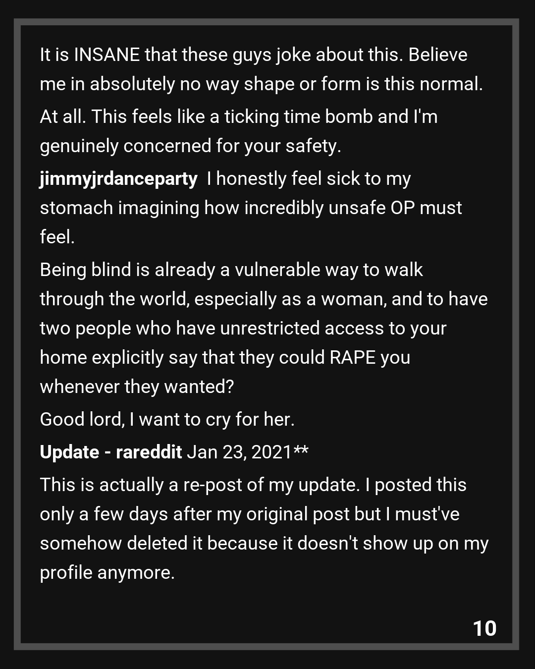I honestly feel sick to my stomach imagining how incredibly unsafe OP must feel. Being blind is already a vulnerable way to walk through the world, especially as a woman, and to have two people who have unrestricted access to your home explicitly say that they could RAPE you whenever they wanted? Good lord, I want to cry for her.