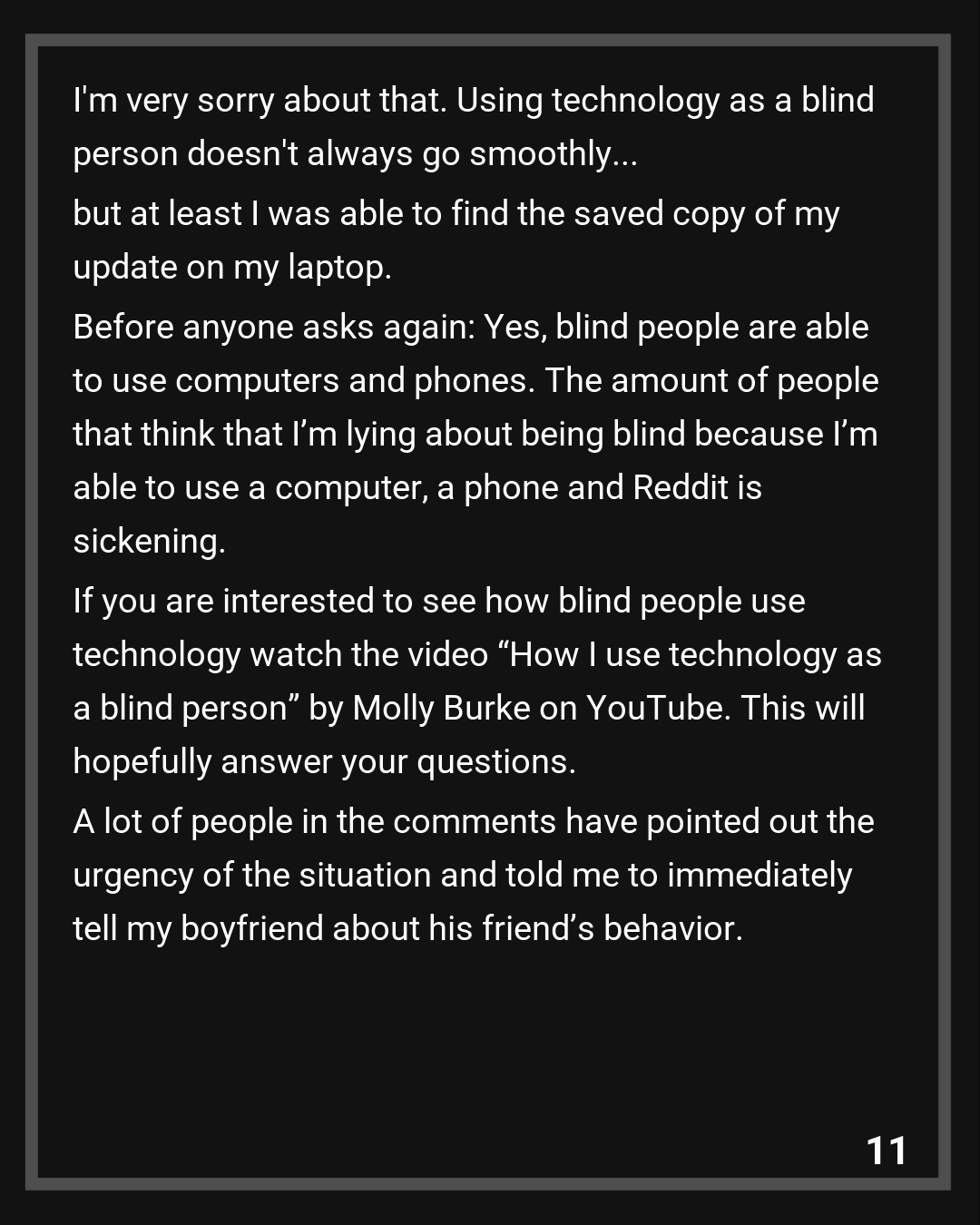 EDIT: There are tons of people asking me how I was able to type this even though I’m blind. I’ve explained it several times in the comments already but people keep commenting about it and I’m getting tired of explaining the same thing over and over again. There is a youtube video called “How I use technology as a blind person” by a woman called Molly Burke. Feel free to watch (or listen to) this video!