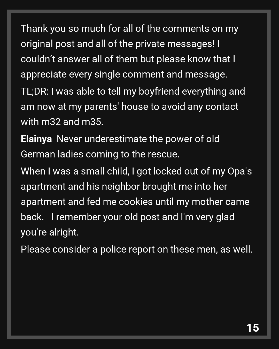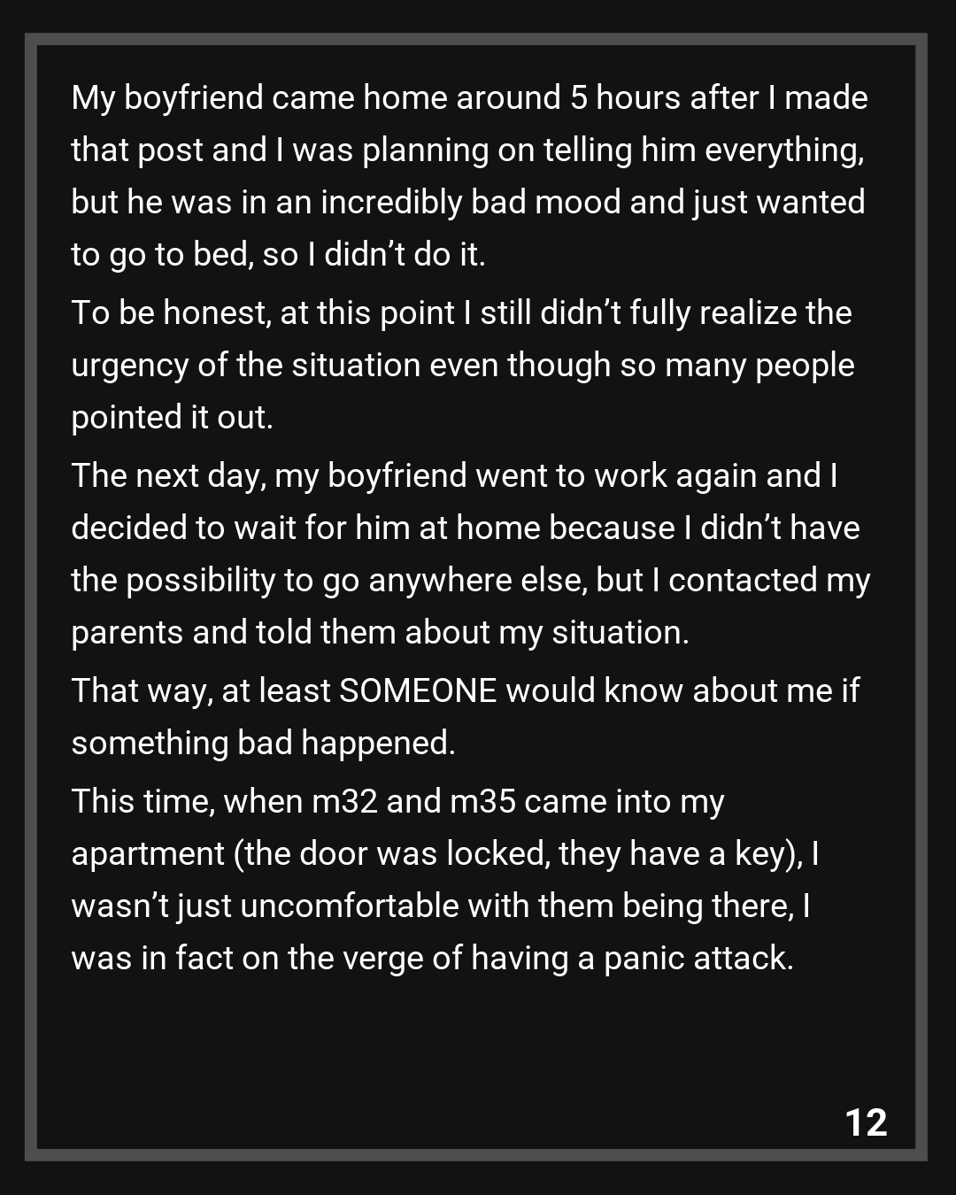 This time, when m32 and m35 came into my apartment (the door was locked, they have a key), I wasn’t just uncomfortable with them being there, I was in fact on the verge of having a panic attack. They must’ve noticed that because they did some disgusting things to me while behaving as if this whole thing was funny. They did NOT rape me but what they did wasn’t okay. I started screaming, which kind of scared off m35 and m32 and luckily an elderly lady from the floor above heard me screaming. I swear, this lady was my guardian angel. She didn’t force me to explain anything and just took me to her apartment. She was comforting me for nearly two hours during which I couldn’t stop bawling my eyes out.
