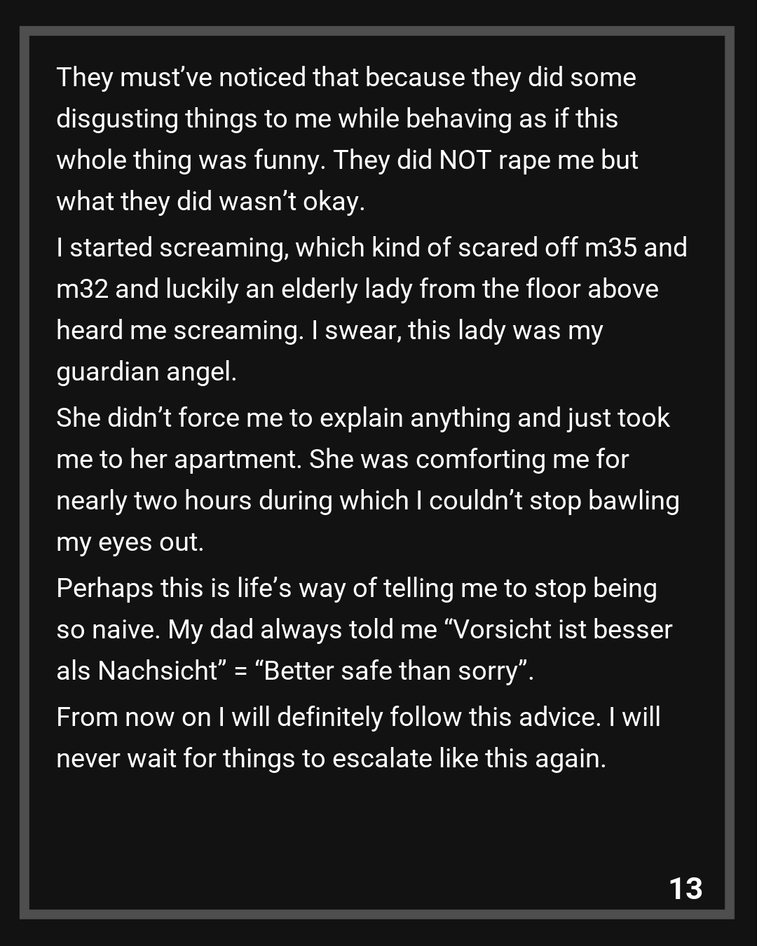 Perhaps this is life’s way of telling me to stop being so naive. My dad always told me “Vorsicht ist besser als Nachsicht” = “Better safe than sorry”. From now on I will definitely follow this advice. I will never wait for things to escalate like this again.