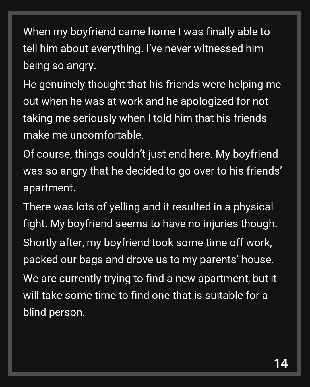 Of course, things couldn’t just end here. My boyfriend was so angry that he decided to go over to his friends’ apartment. There was lots of yelling and it resulted in a physical fight. My boyfriend seems to have no injuries though. Shortly after, my boyfriend took some time off work, packed our bags and drove us to my parents’ house. We are currently trying to find a new apartment, but it will take some time to find one that is suitable for a blind person.